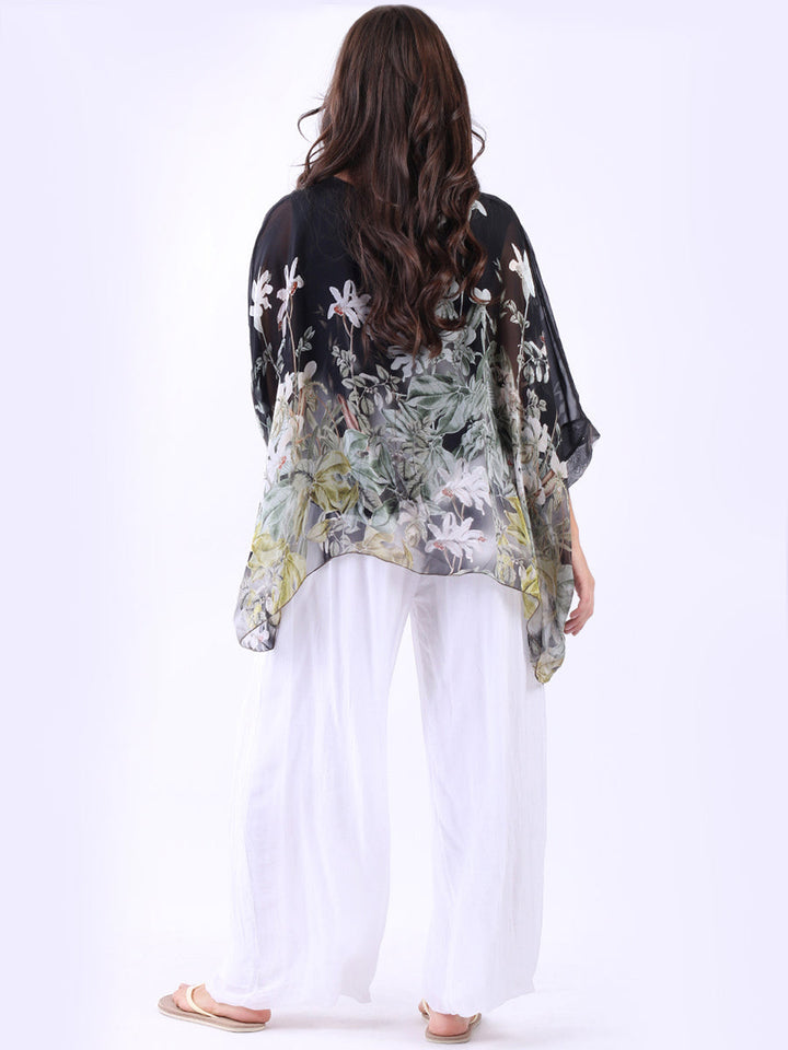 Graceful and lightweight, this made in Italy silk tunic top brings a touch of elegance to everyday dressing. Beautifully double layered for a fluid, flattering drape, it showcases a delicate floral print that exudes feminine charm. The softly curved bay neckline adds a refined detail, while batwing sleeves offer an airy silhouette with effortless movement. A perfect choice for women who value both comfort and sophistication, this tunic pairs beautifully with tailored trousers or relaxed-fit pants for a polished yet relaxed look.