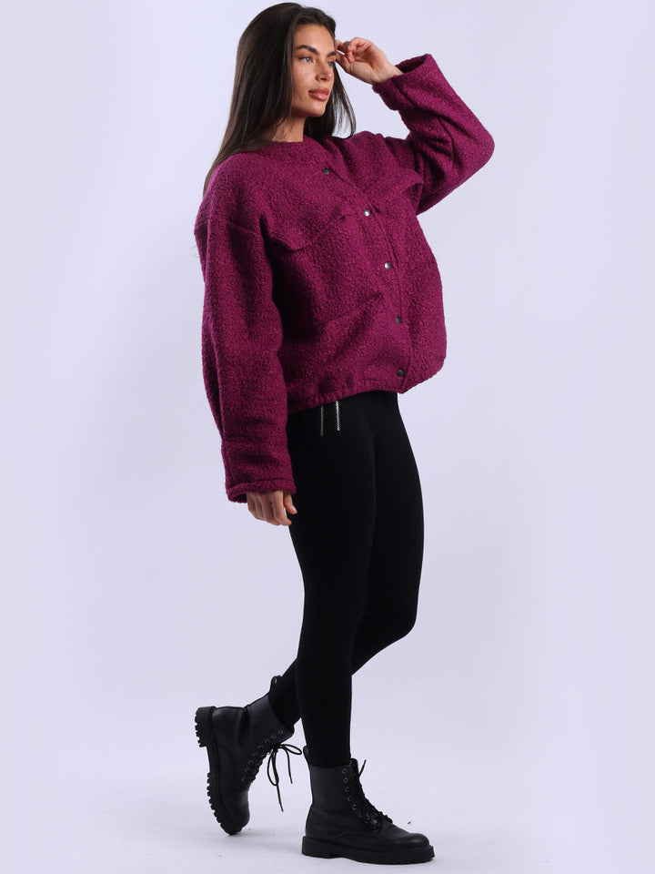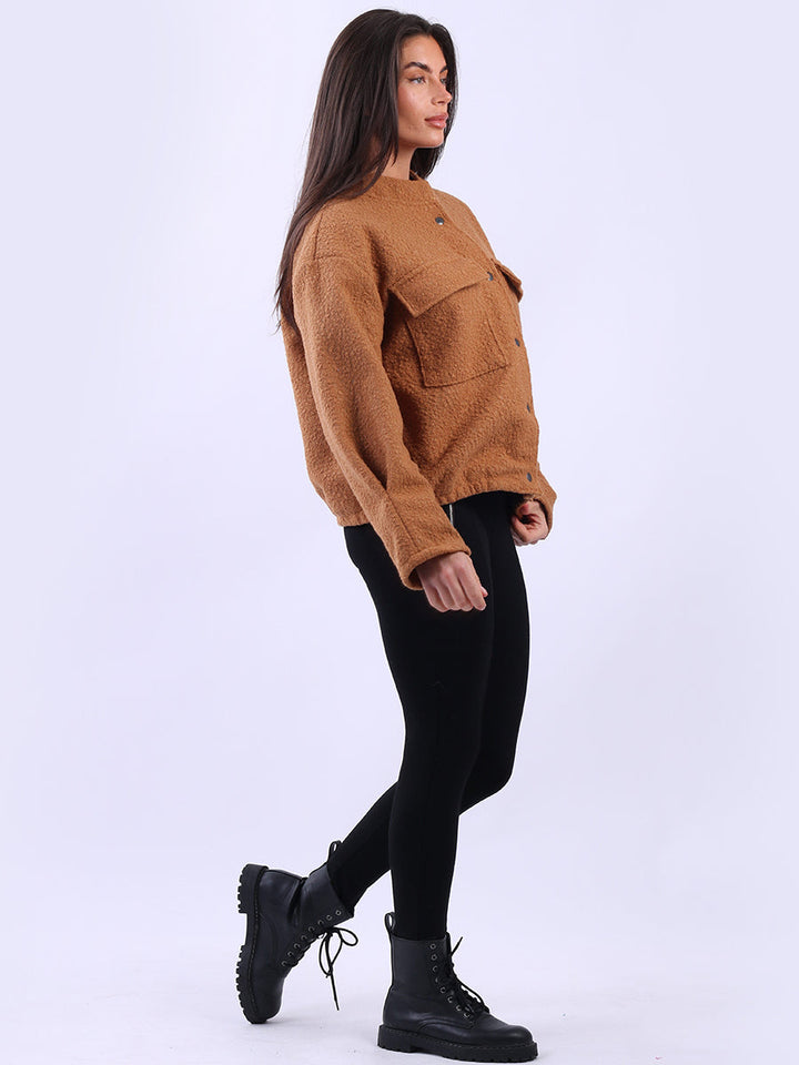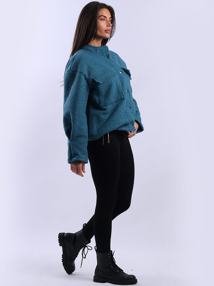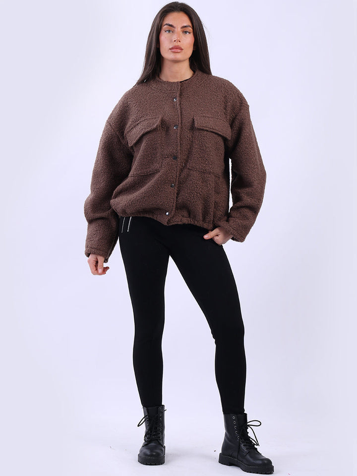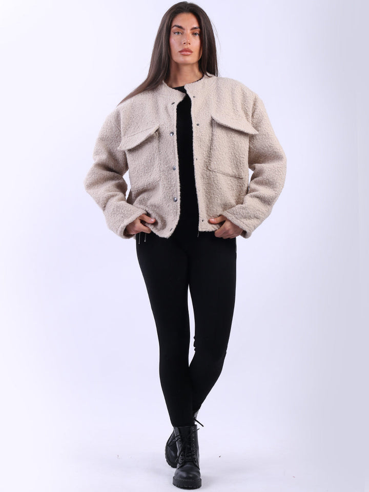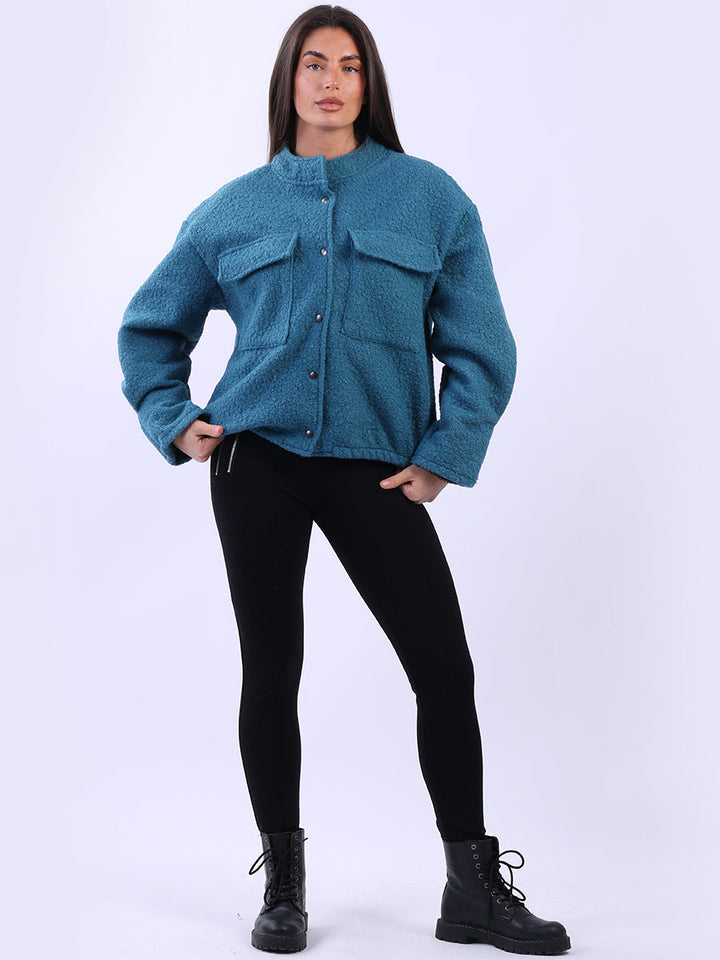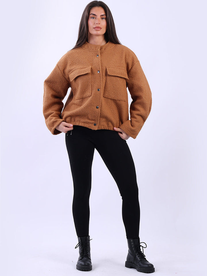 An effortlessly chic woolen jacket by Online Clothing store USA for women wearers who exude confidence in every casual or formal gathering with their timeless fashion sense. This piece radiates elegance and sophistication, featuring front flap pockets and a band collar. An ideal choice for those who appreciate everlasting winter style.