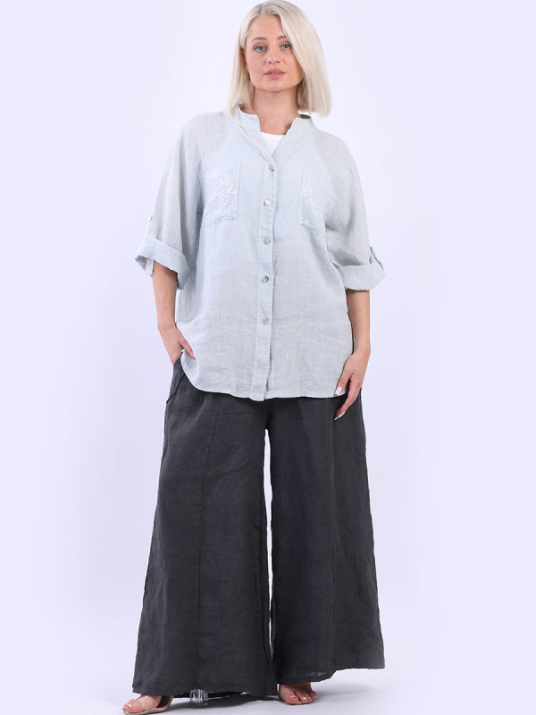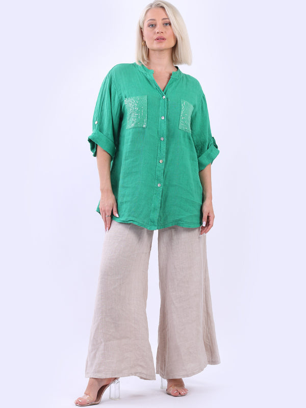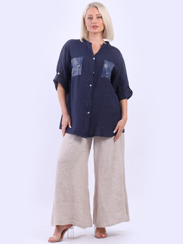 Elegant and effortless the baggy plus size blouse is made in Italy for promising quality, ban collar neckline, bold colors and front sequin pockets. The soft breathable lino is just all hype for all the right reasons as it is light weight and breezy. Front pockets and long button up buckle sleeves make it practical and work ready versatile. Dress it with wide leg pants and wedges for crisp finish.