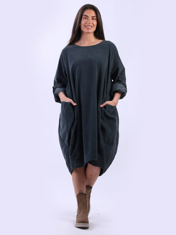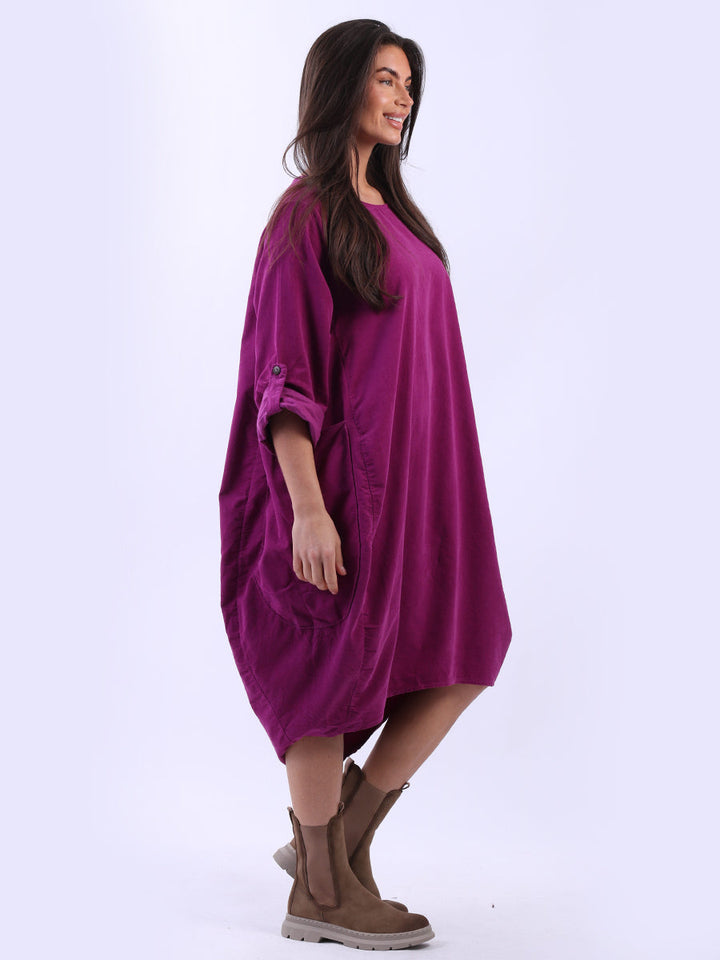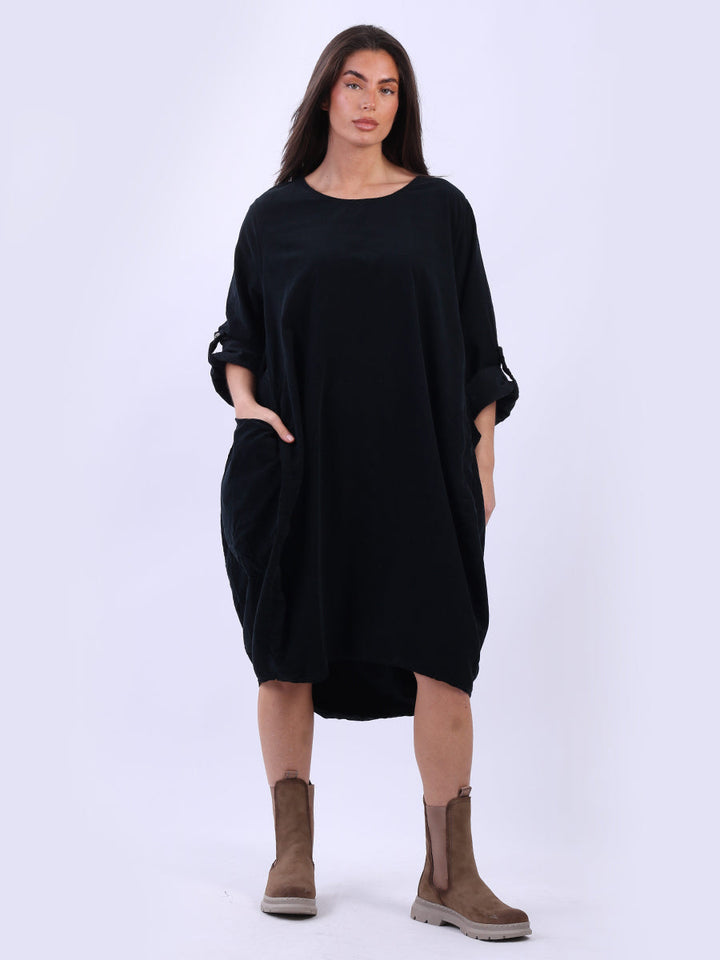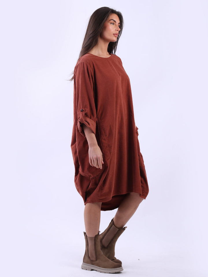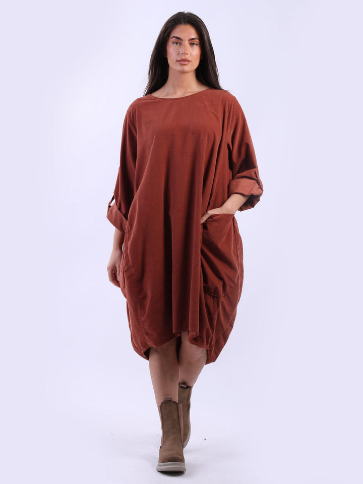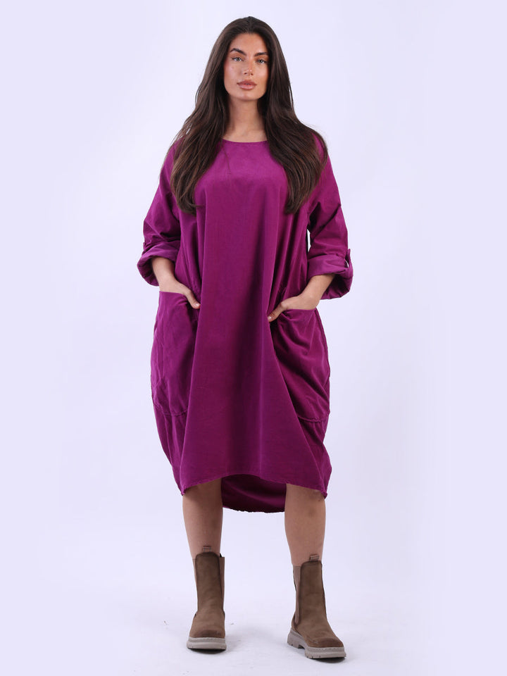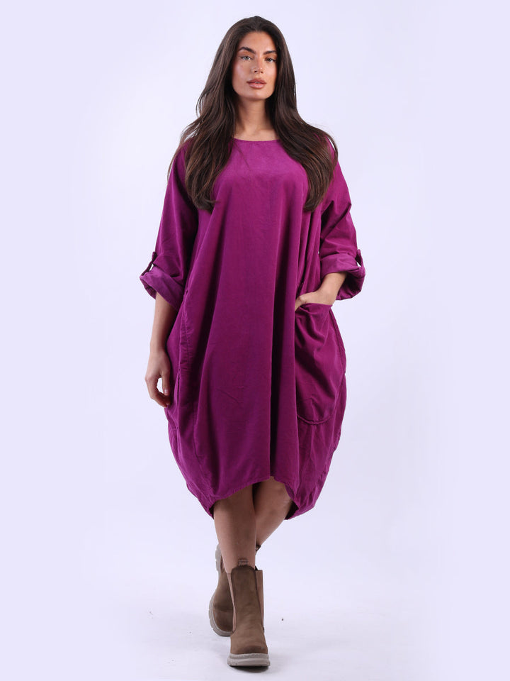 As winter arrives, this cotton corduroy lagenlook swing dress from Purplewholesale becomes a go-to fashion staple. Its oversized fit and tabbed sleeves make it suitable for transitional weather, it is stunning to layer with a jacket. A must-have for versatile seasonal dressing.