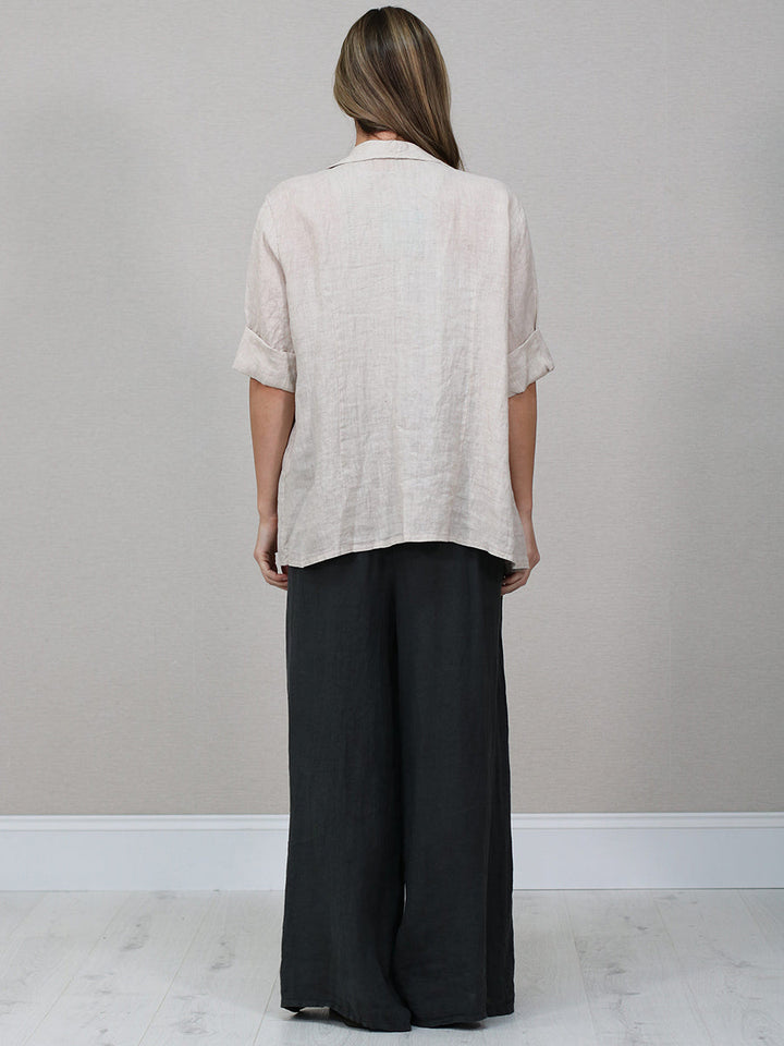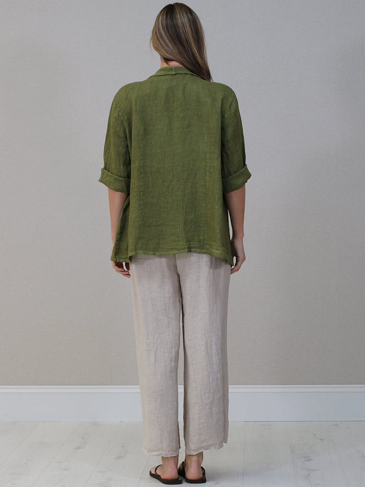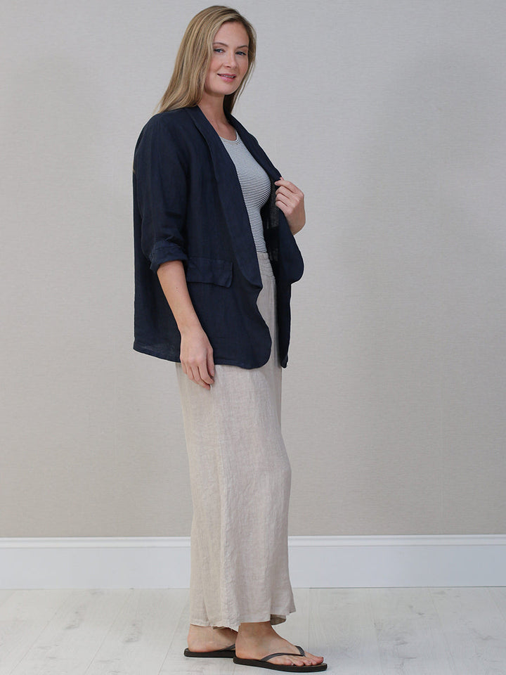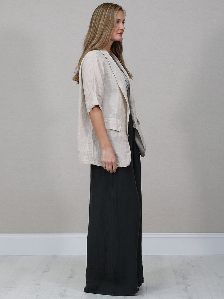 Purplewholesale presents this solid linen jacket, a perfect choice for ladies who prefer simplicity and elegant summer clothing. Made of super-soft and breathable linen, this jacket is also ideal for plus-size women. This timeless jacket is made in Italy and provides a comfortable feeling, with side pockets, a classic collar, rollable short sleeves, and natural linen texture, it is the ultimate plain jacket you will keep on wearing.