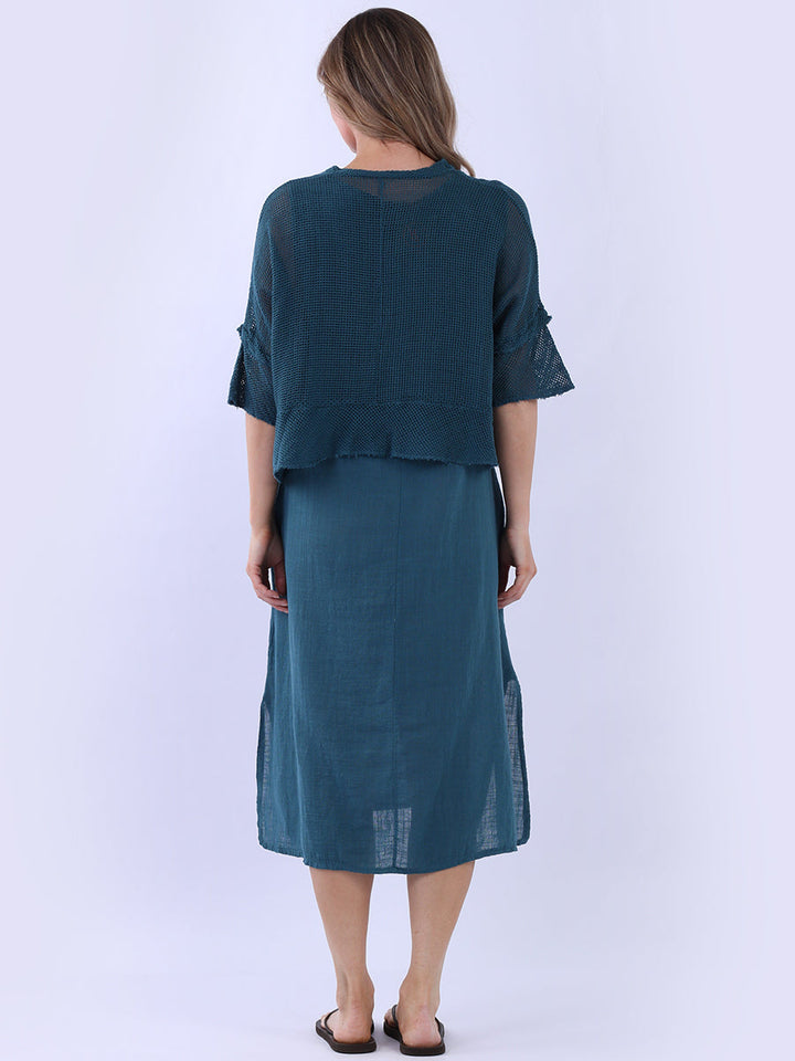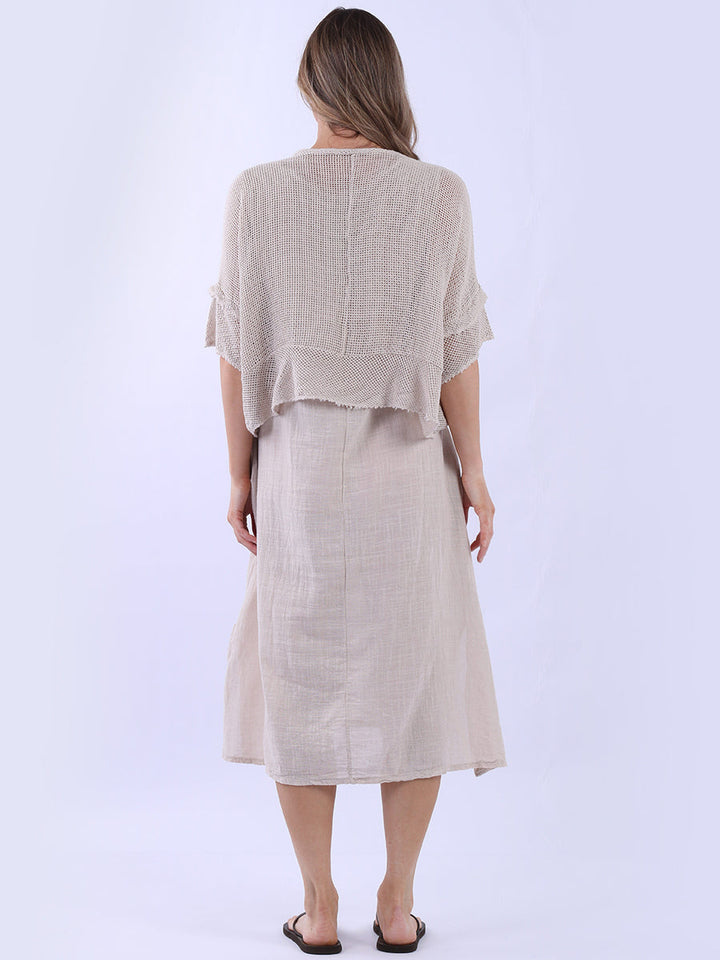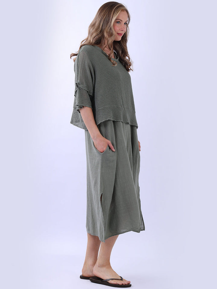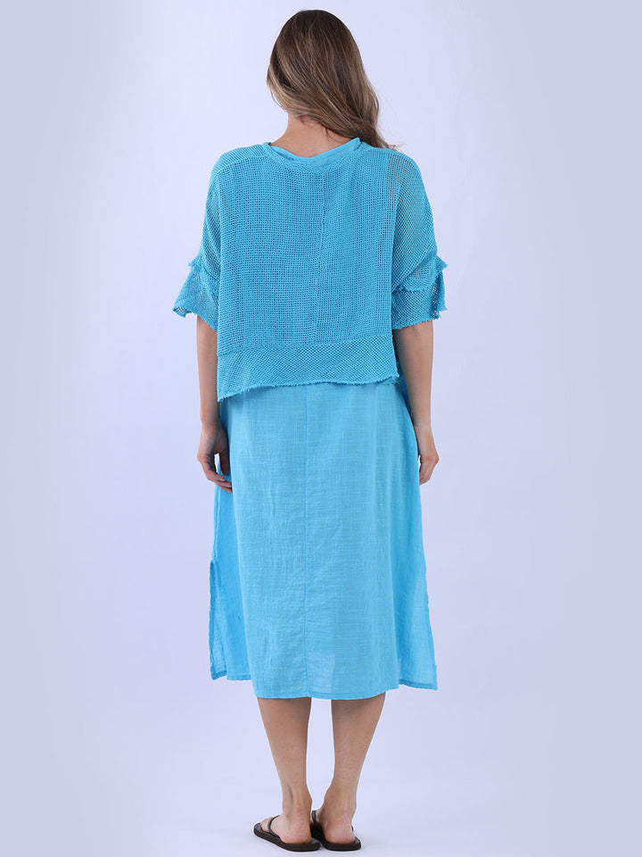 This two-layered mesh net cotton dress is made in Italy, featuring a mesh net bodice, batwing sleeves, and side slits adding a feminine touch to summer wardrobe of women wearers. The pure cotton fabric of this midi dress ensures its quality with comfort and its flowy design, making it perfect for layering with a cardigan from PurpleWholesale Fashion Boutique USA.