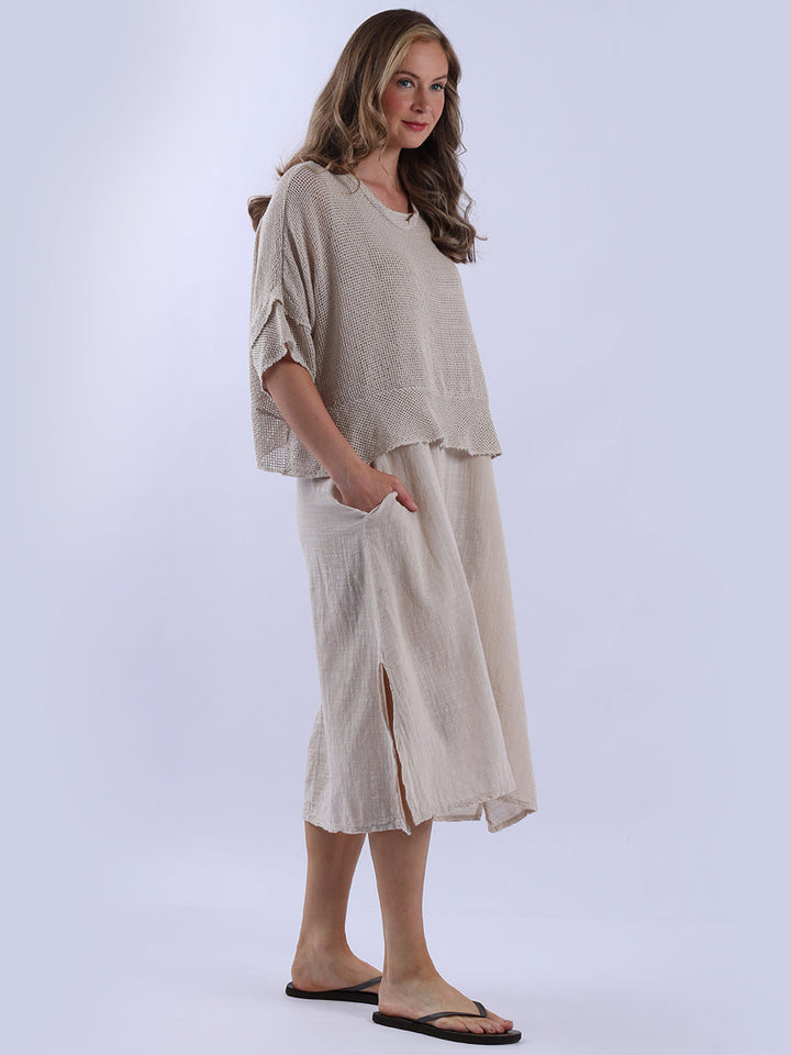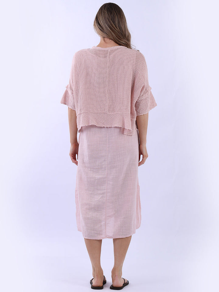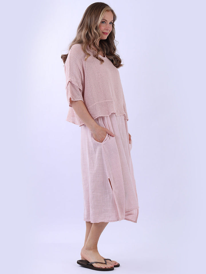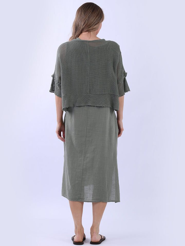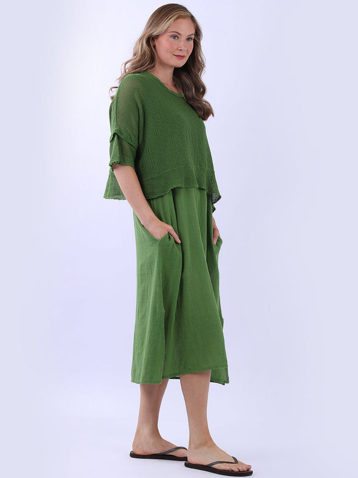 This two-layered mesh net cotton dress is made in Italy, featuring a mesh net bodice, batwing sleeves, and side slits adding a feminine touch to summer wardrobe of women wearers. The pure cotton fabric of this midi dress ensures its quality with comfort and its flowy design, making it perfect for layering with a cardigan from PurpleWholesale Fashion Boutique USA.
