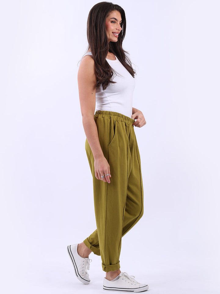 Wholesale Fashion Store USA offers this made-in-Italy solid cotton trouser. With a comfortable elastic waist, practical side pockets, rolled-up hem, and a clean design, this trouser embodies classic old-money aesthetics. This is appealing to ladies who appreciate refined, versatile fashion.