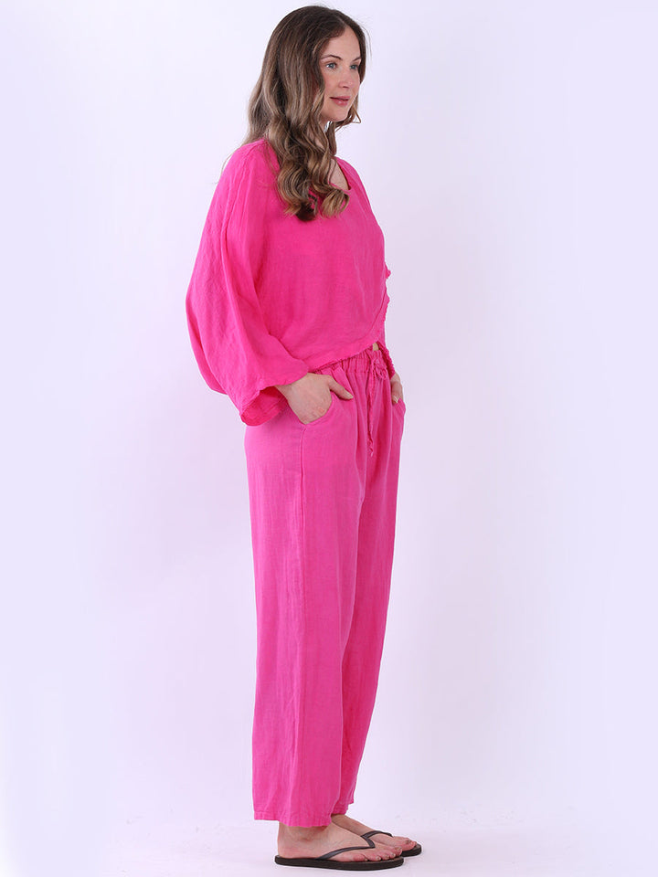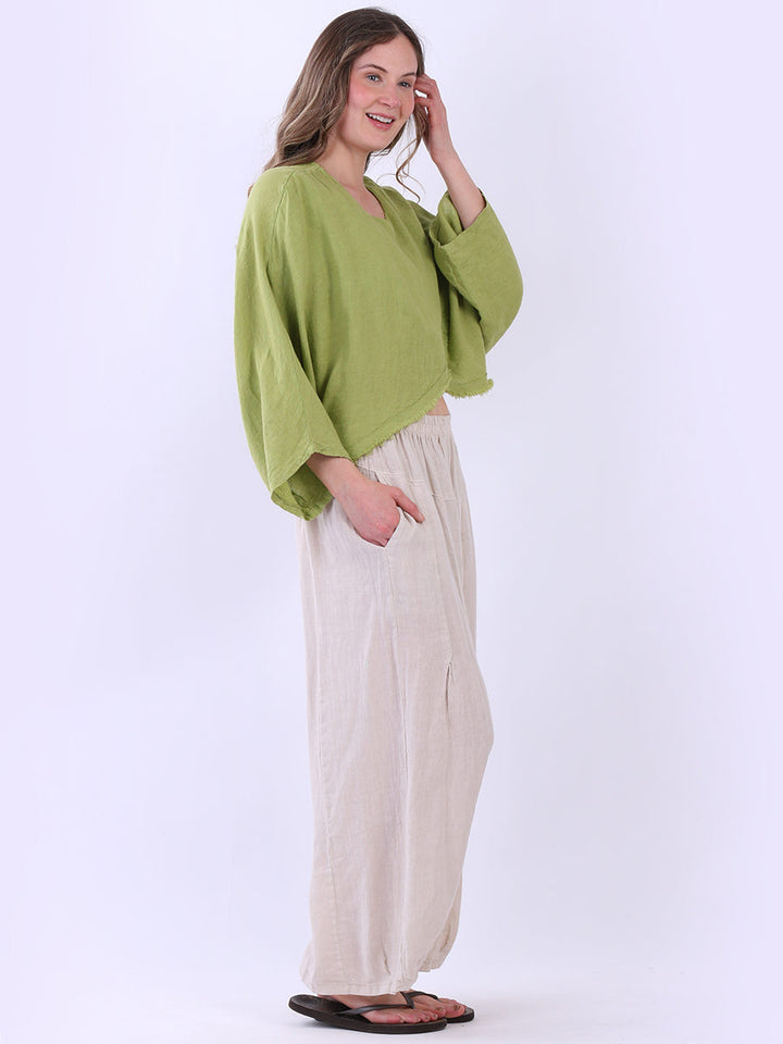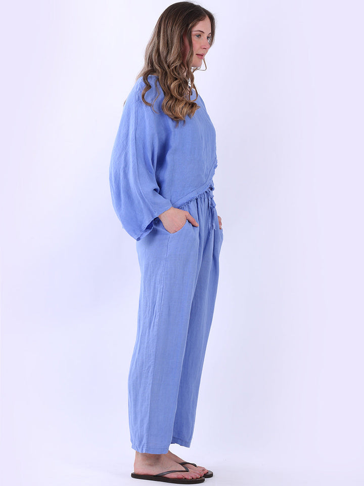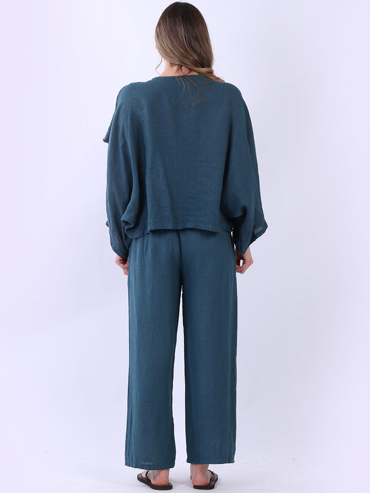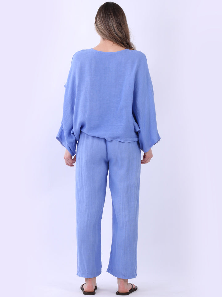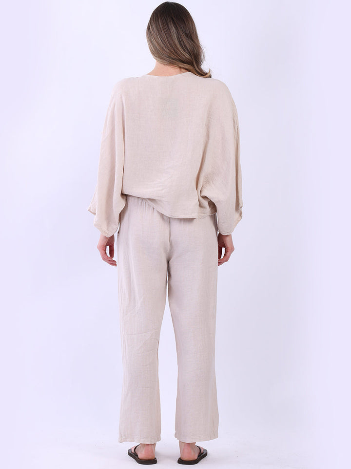 A minimalist batwing top from Purplewholesale USA, crafted in breathable plain linen. The asymmetric hem and wrap-over design offers casualwear buyers a dependable layering piece with a modern cut and relaxed profile.