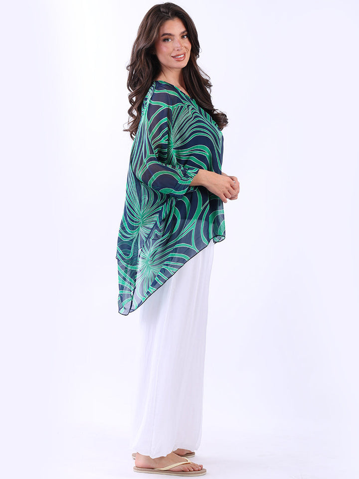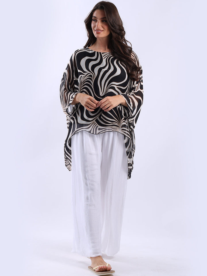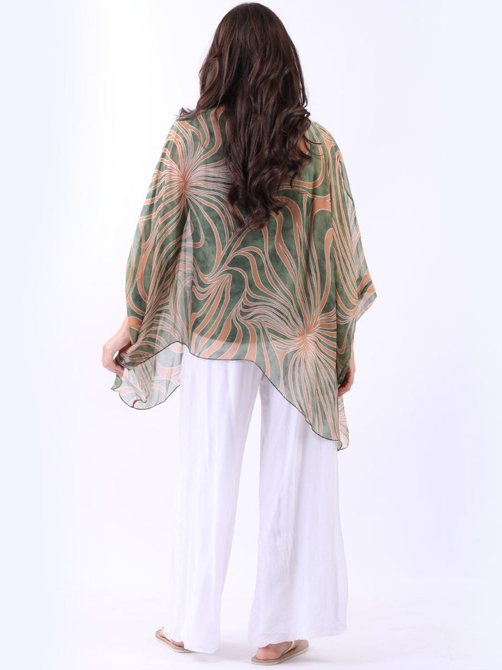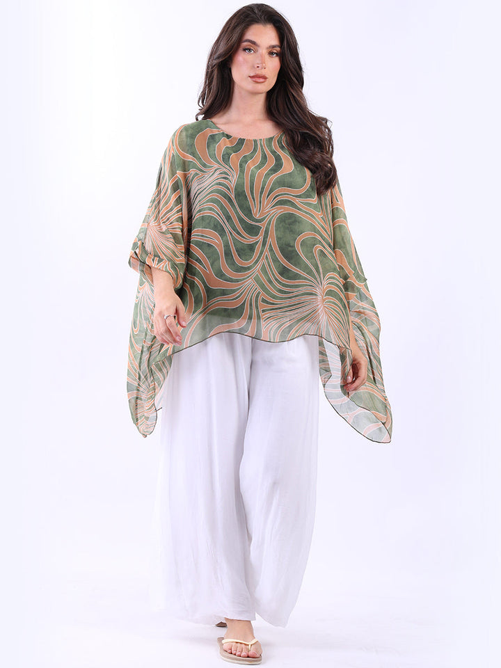 Graceful and eye-catching, this double layer silk tunic top is a beautiful blend of comfort and elegance. Made in Italy, it features a flowing silhouette with airy batwing sleeves and a flattering bay neckline. The delicate swirl print adds a touch of artistic flair, while the double-layered design offers a lightweight yet refined finish. Ideal for women who appreciate effortless style, this tunic brings a soft, sophisticated charm to any wardrobe.
