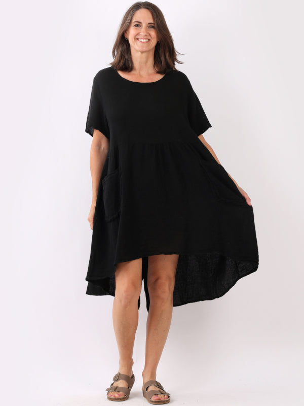 Made In Italy Plain Vintage Washed Linen Lagenlook Swing Midi Dress