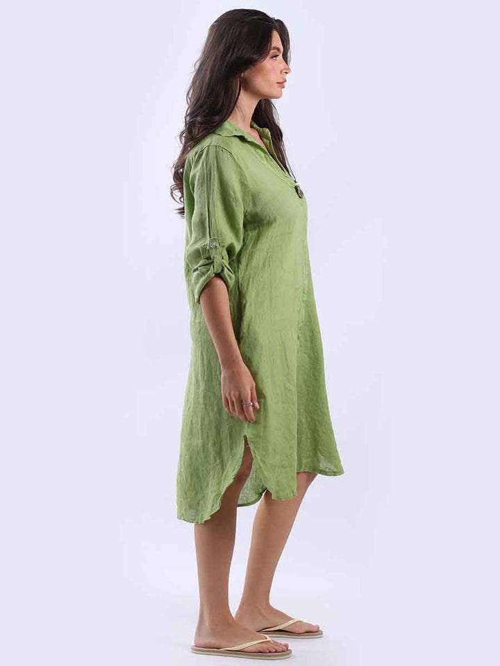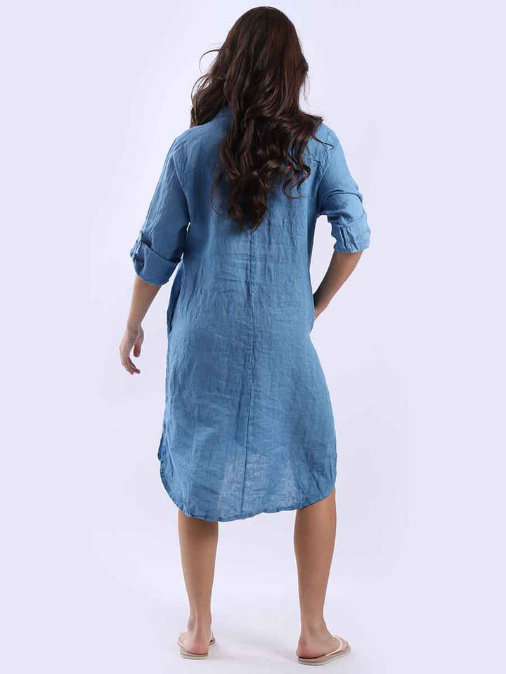 This lagenlook dress offers a modern take on everyday elegance. Featuring a sharp collared neckline and tabbed sleeves, made in Italy this plain dress is styled with a decorative front button for a hint of visual interest. The side pockets add functional appeal, while side slits and a dipped hemline create a soft, flowing silhouette. Designed for women who favour relaxed layering with a touch of structure, this dress transitions effortlessly from laid-back outings to more polished settings. Available at Purple Wholesale, your go-to online clothing store USA.