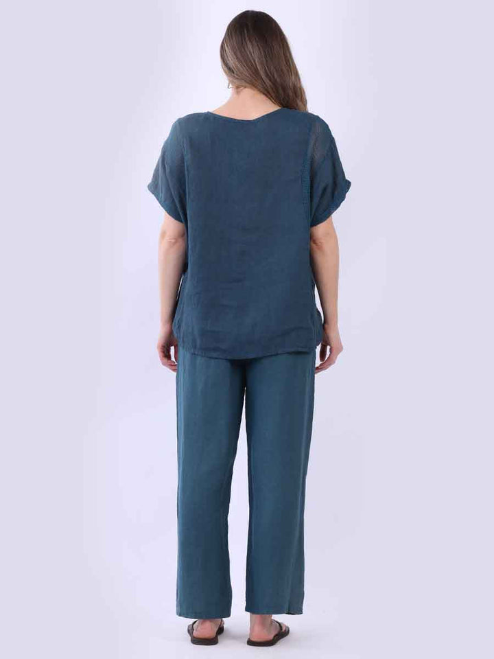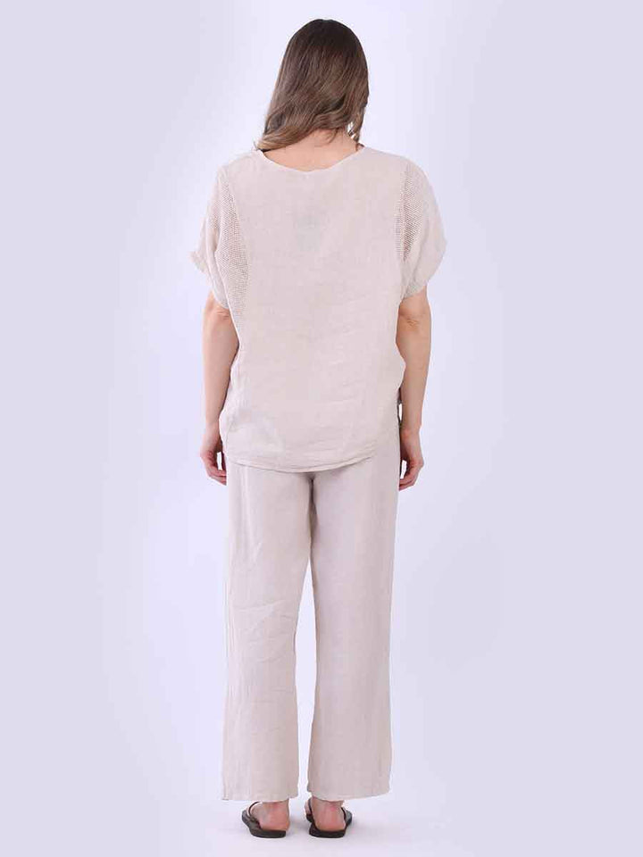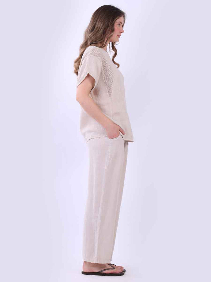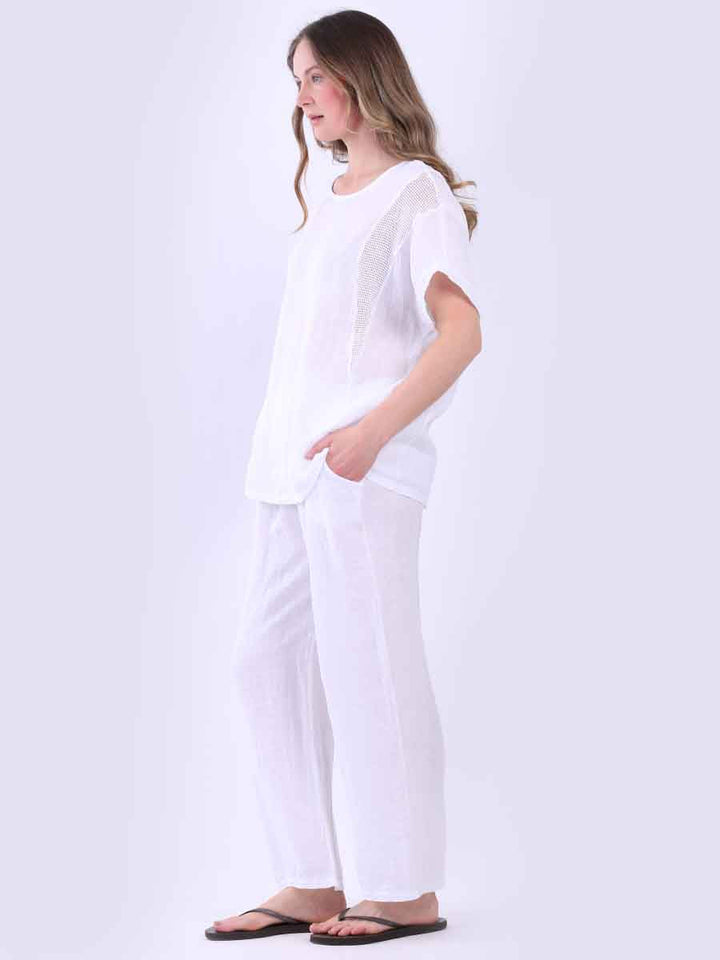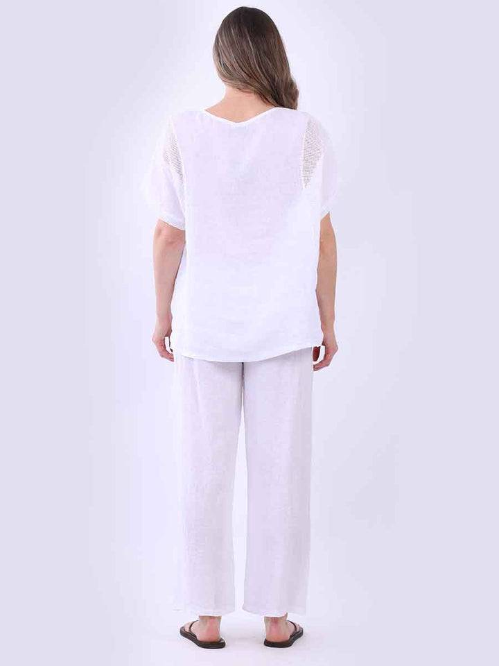 A plain linen top with mesh details, crafted in Italy in a loose, oversized shape. It breathes poetry into everyday looks, perfect for pairing with wide trousers and soft earrings for understated beauty.