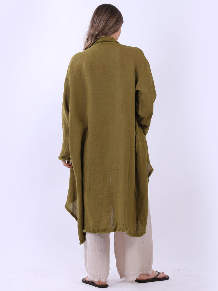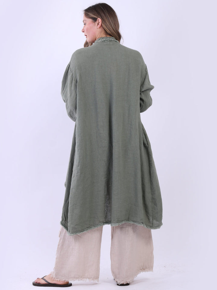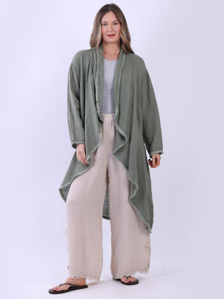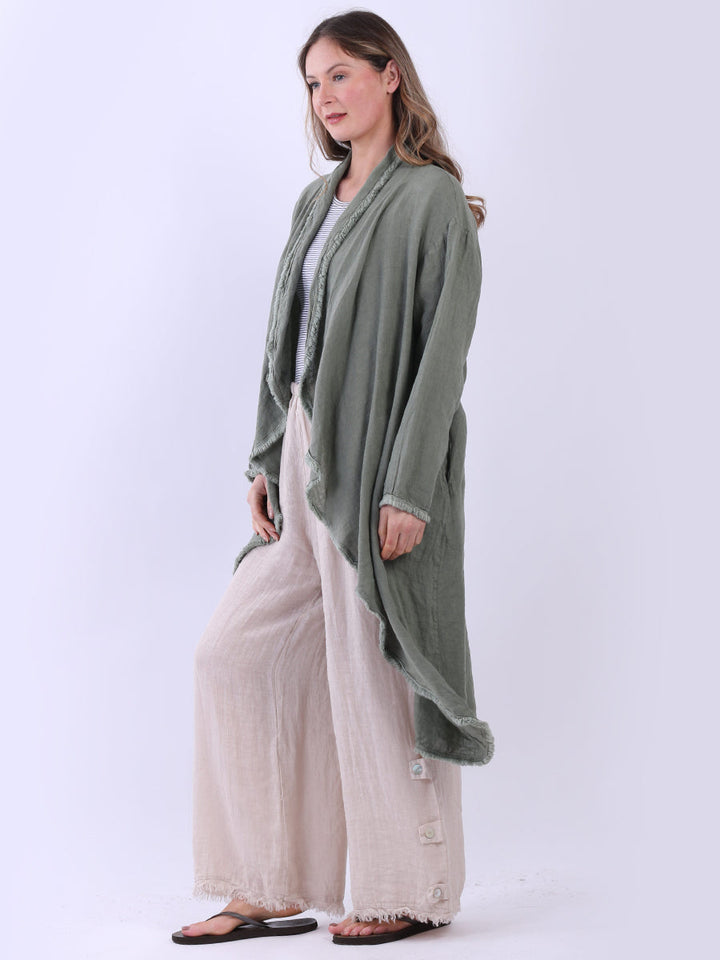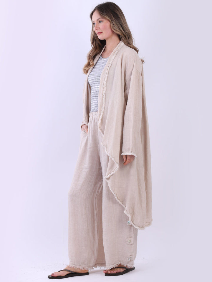 A made-in-Italy fringed linen cardigan from Purple Wholesale that beautifully combines elegance and simplicity. The open-front design and flowy silhouette are perfect for layering over those light spring outfits or the breezy styles of summer. The plain color goes really well with natural tones, and the light fabric keeps ladies comfy on warm days and cool nights. A stylish and practical option for your seasonal looks from Purple Wholesale.