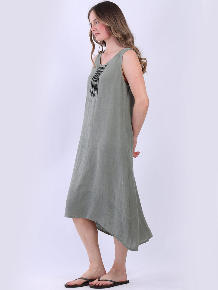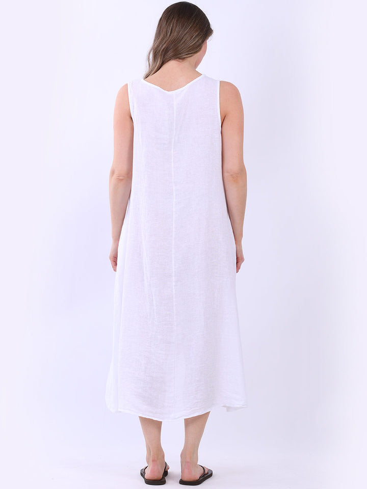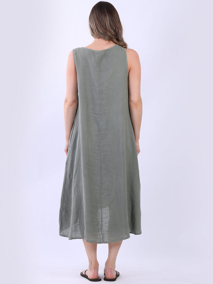 Plain, breathable, and effortlessly roomy, this sleeveless lagenlook linen dress is built for relaxed, easy dressing. Featuring a hi-low hem and soft front pleats, it carries a simple, feminine vibe perfect for casual collections. A reliable pick for laid-back summer edits.