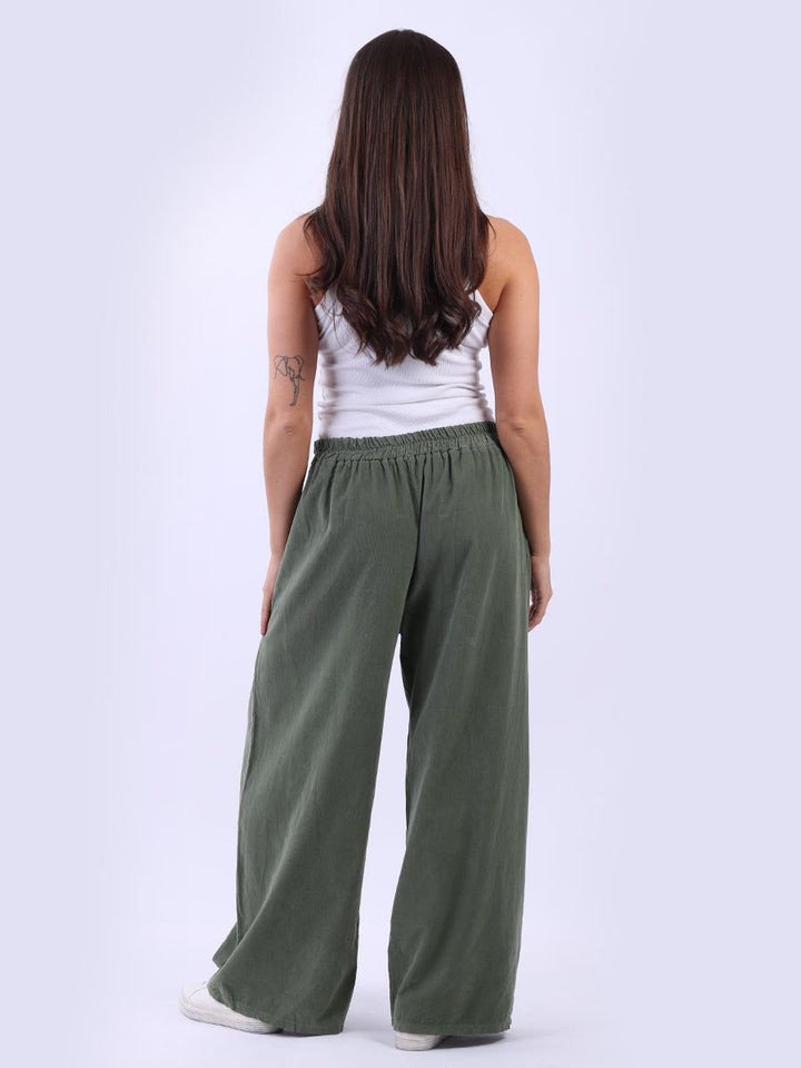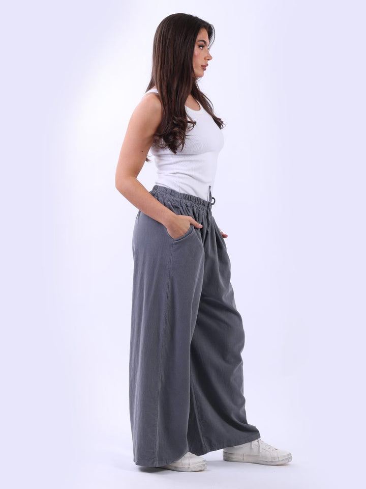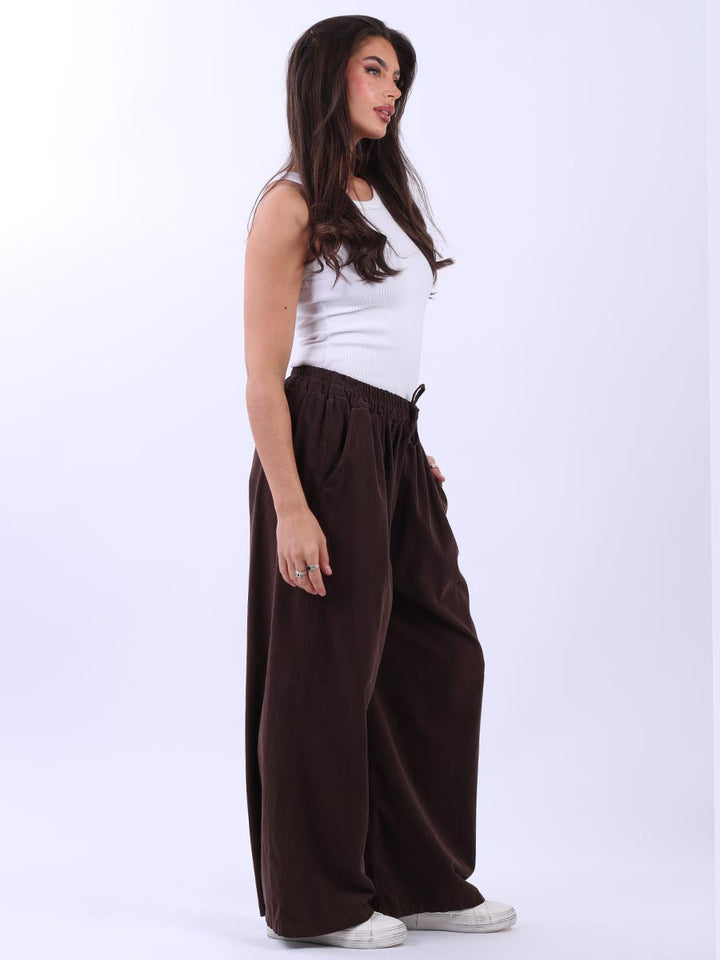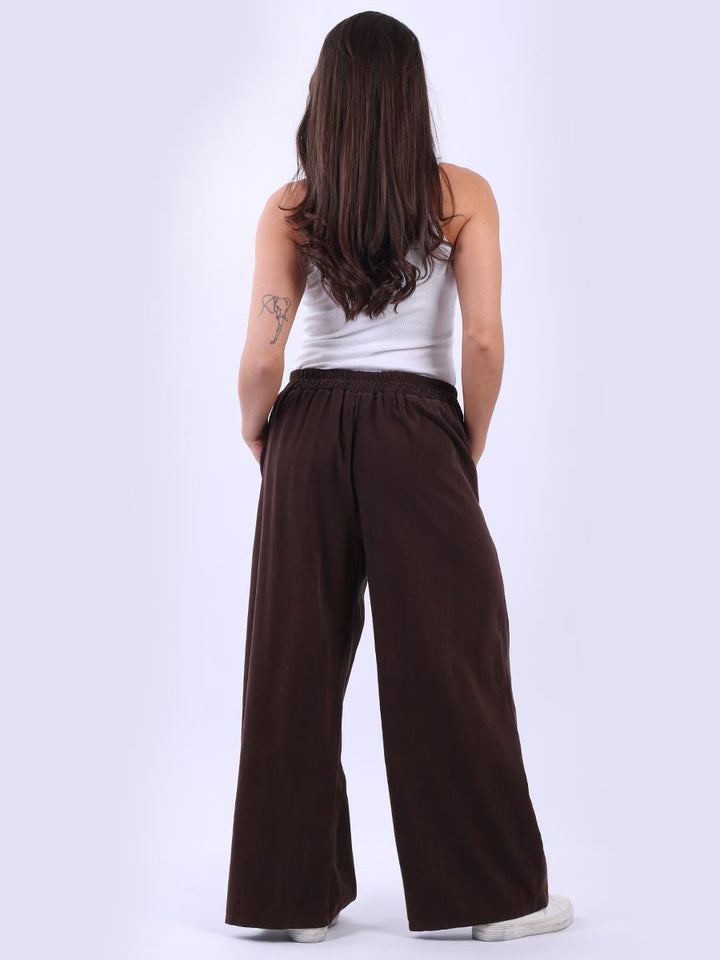Lightweight solid corduroy palazzo pant from Purple Wholesale Clothing store is crafted from pure cotton for a luxurious feel. With a wide-leg design, side pockets, and adjustable drawstring, it drapes effortlessly, making it a standout piece for women seeking comfort and drama in their fall wardrobe.