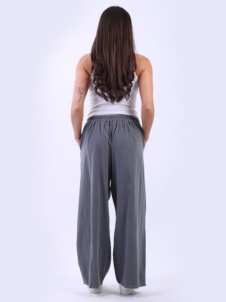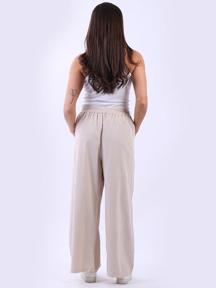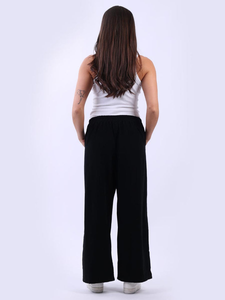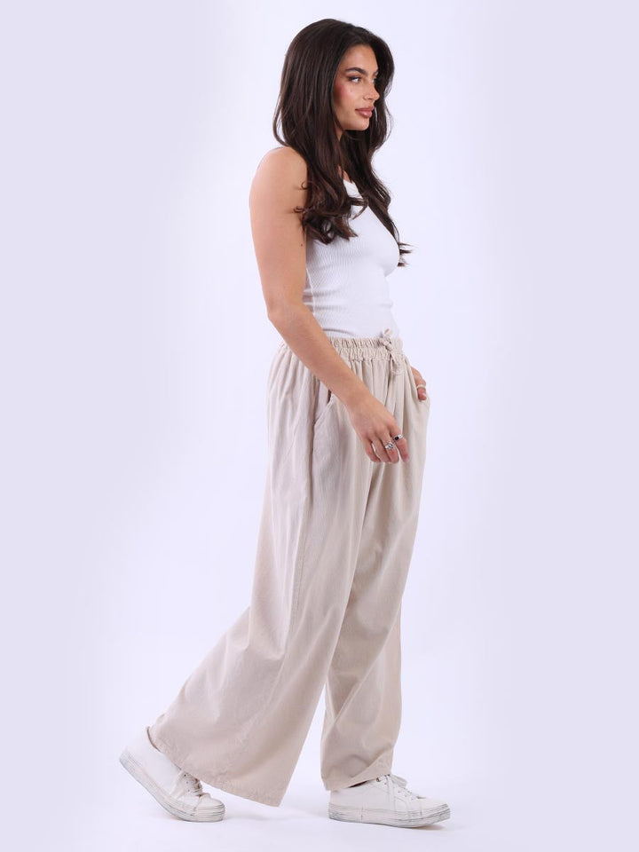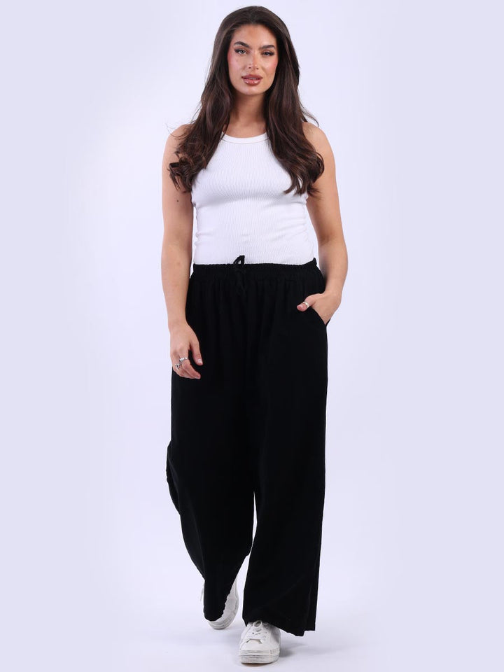 Lightweight solid corduroy palazzo pant from Purple Wholesale Clothing store is crafted from pure cotton for a luxurious feel. With a wide-leg design, side pockets, and adjustable drawstring, it drapes effortlessly, making it a standout piece for women seeking comfort and drama in their fall wardrobe.