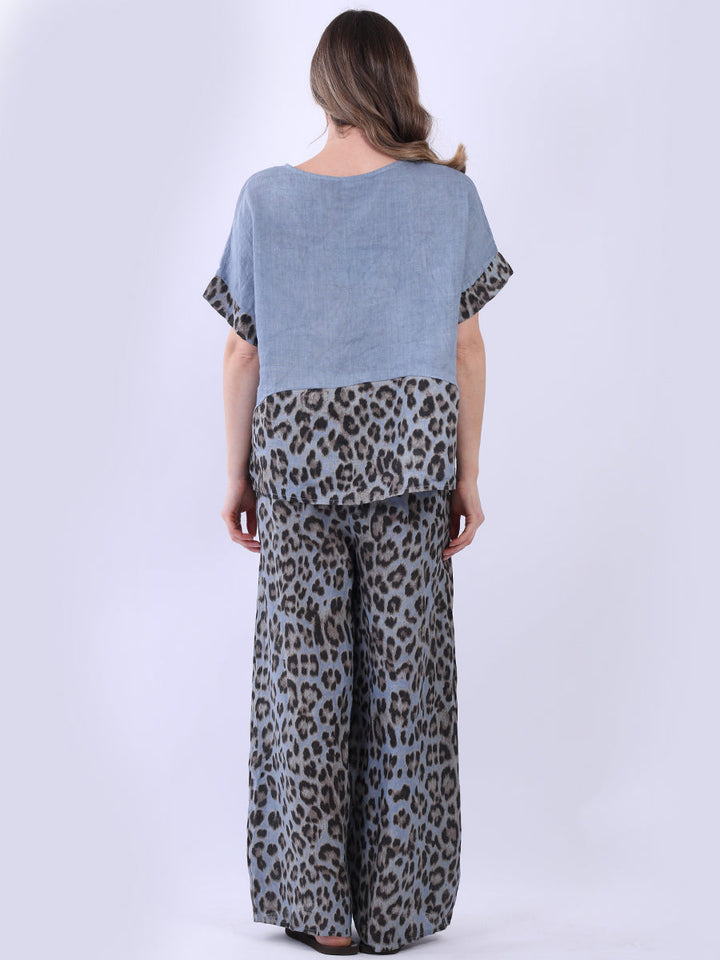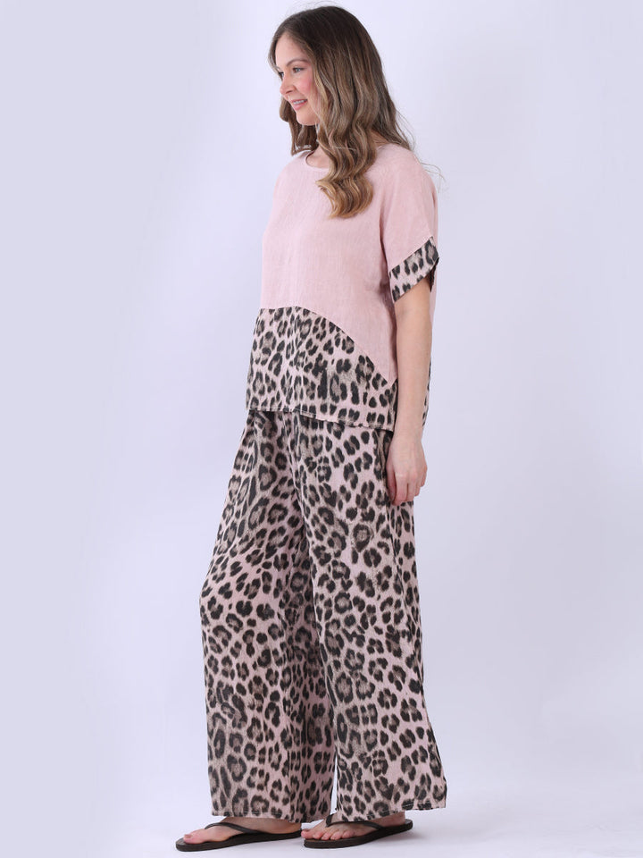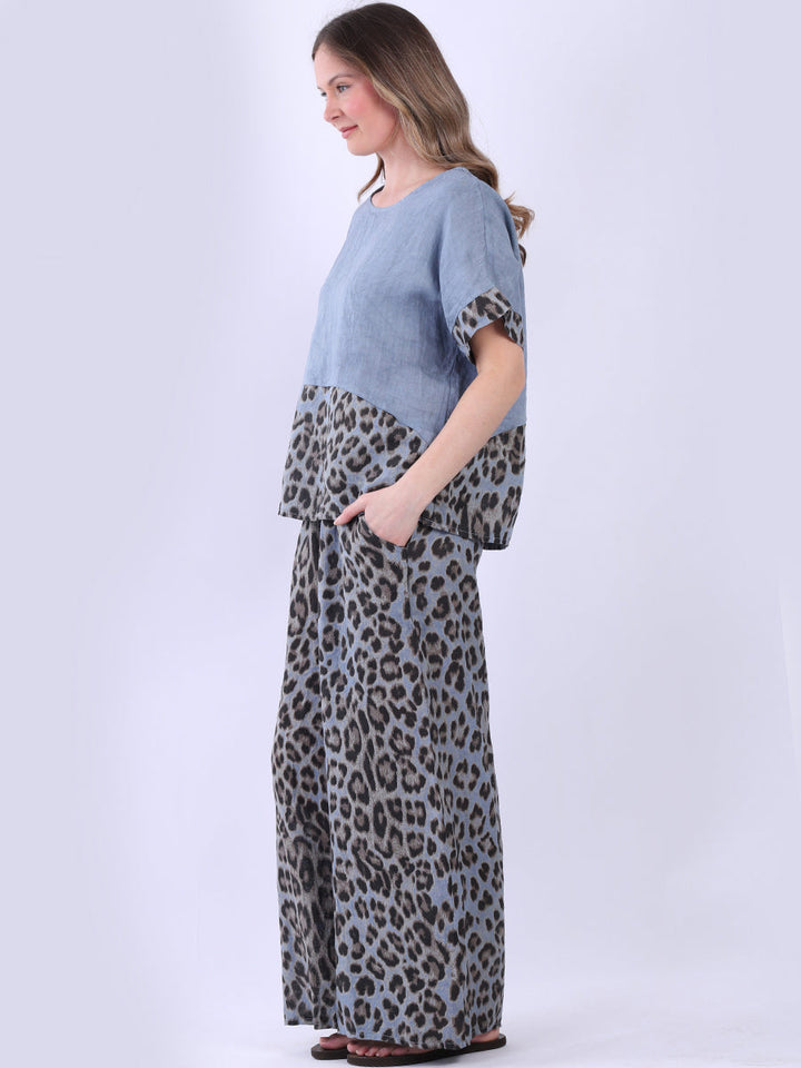 The piece displays art in contrast and elegance in motion. This Italian linen top from Purple Wholesale blends soft batwing sleeves with a striking leopard print panel. Light as air, its plain fabric flows effortlessly. Perfect for women who embrace both calm and daring in their summer collection.