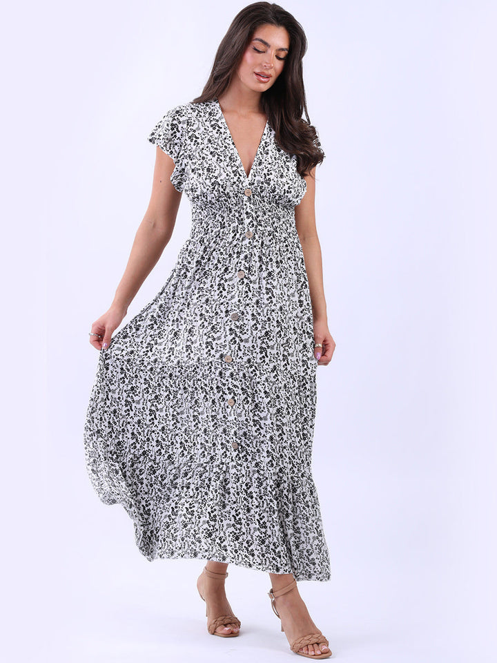 Embrace the essence of femininity with this beautiful floral maxi dress. Made in Italy, this soft boho dress exudes a romantic vibe with a short ruffle sleeves design, smocked waist, and V-neck complimented by sophisticated front buttons. The overall loose fit adds a flow to every move. Pair it with block heels for a stunning look.