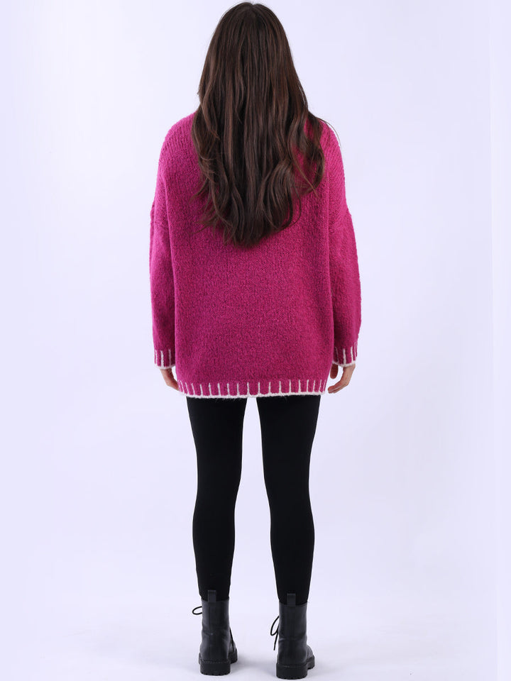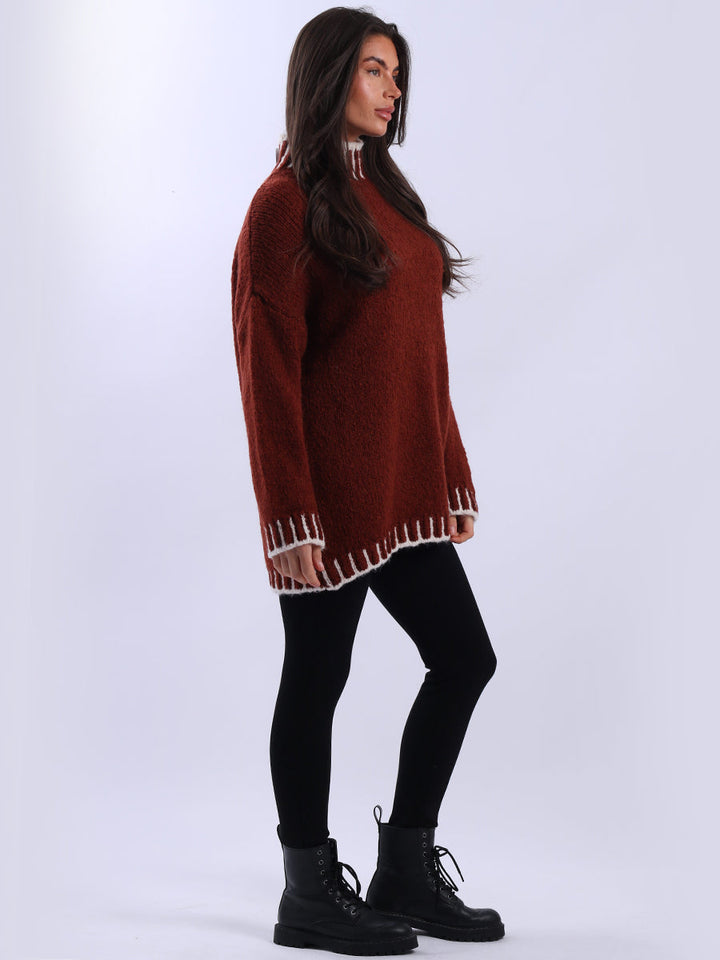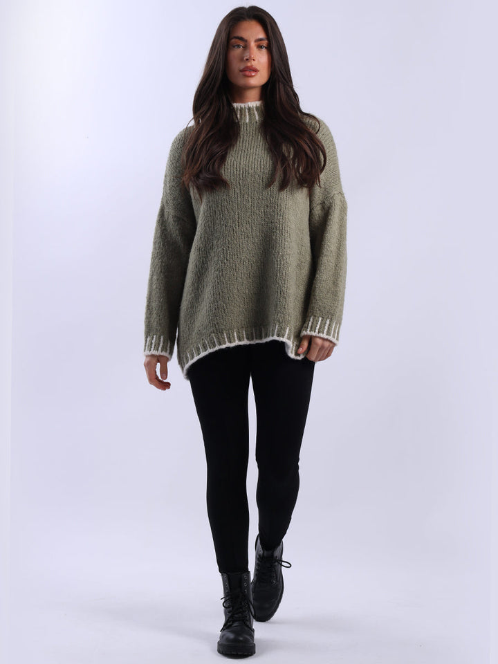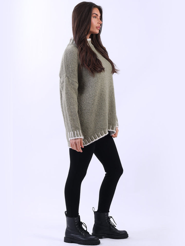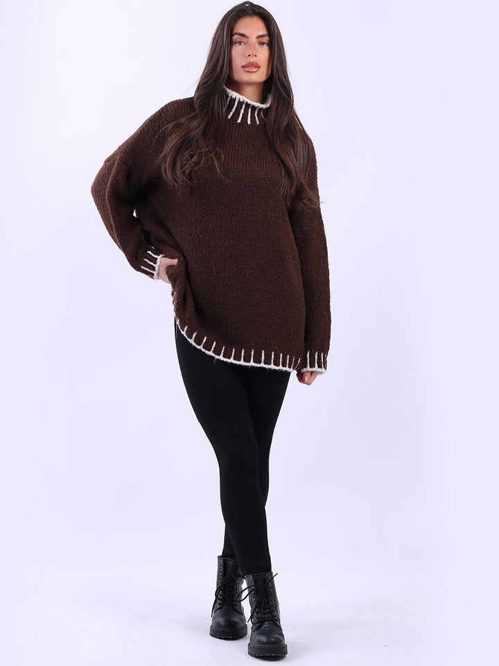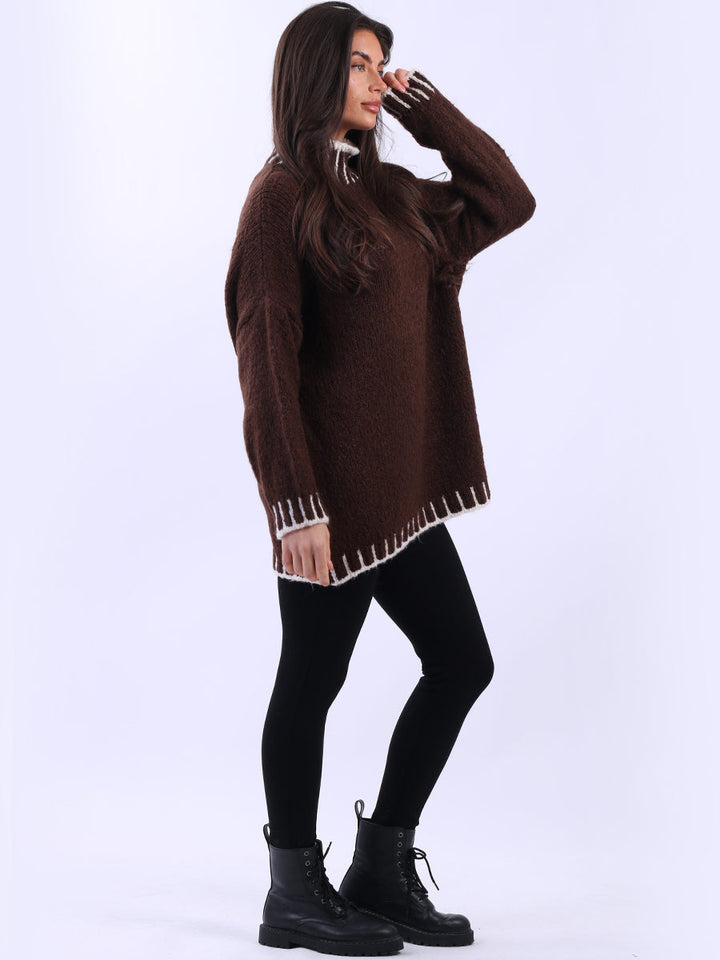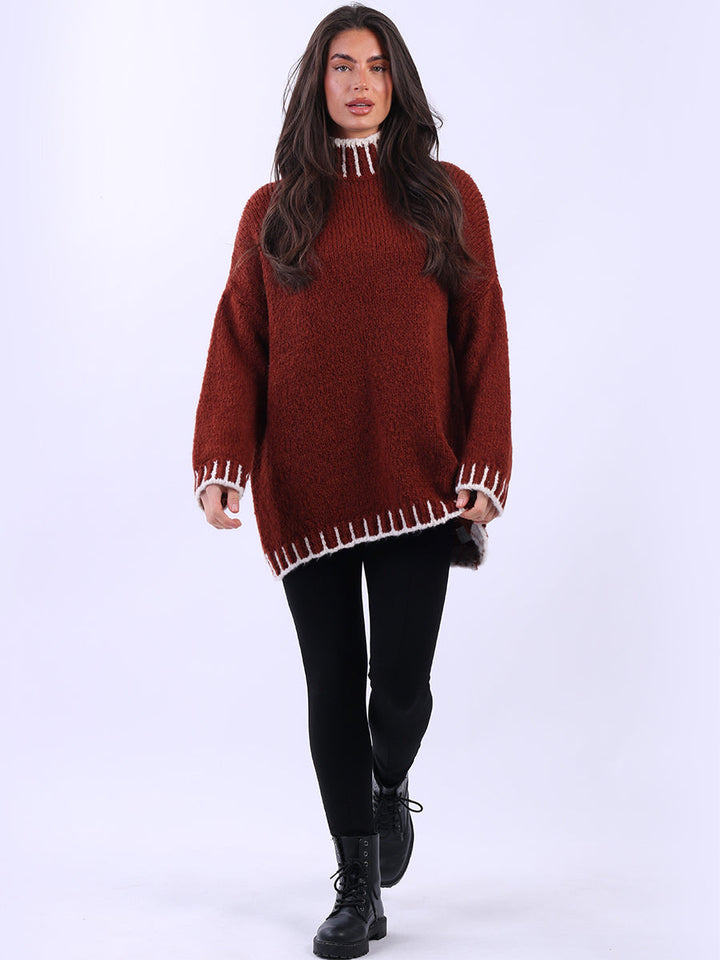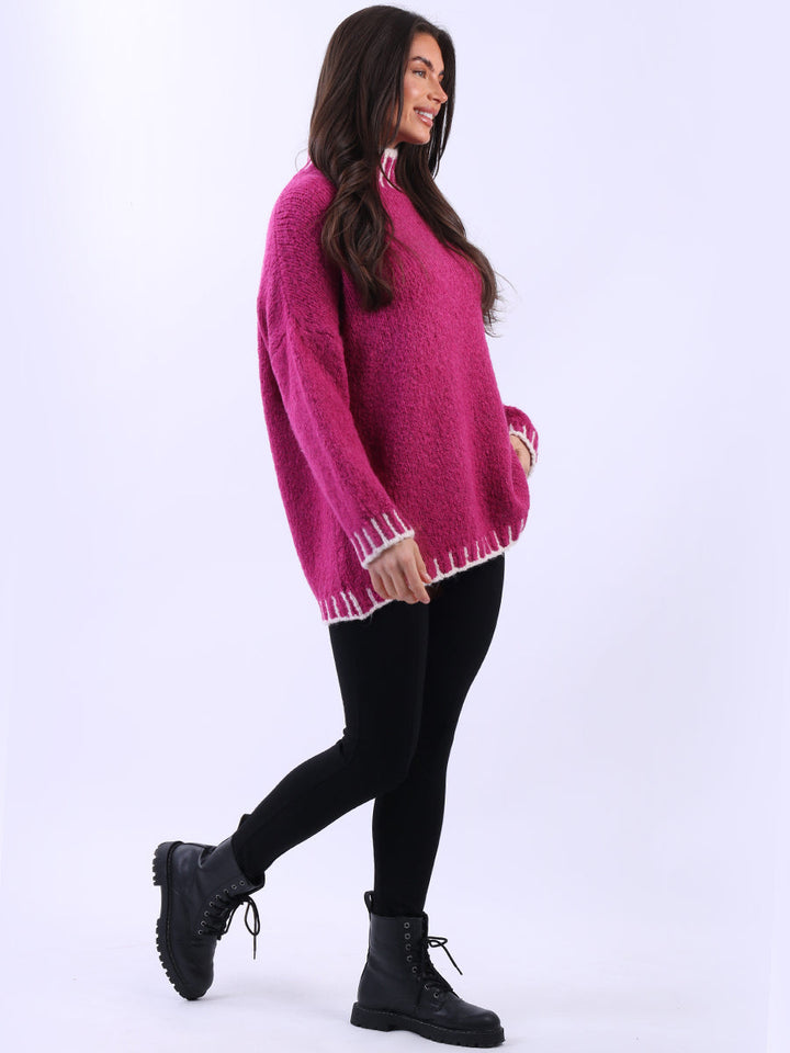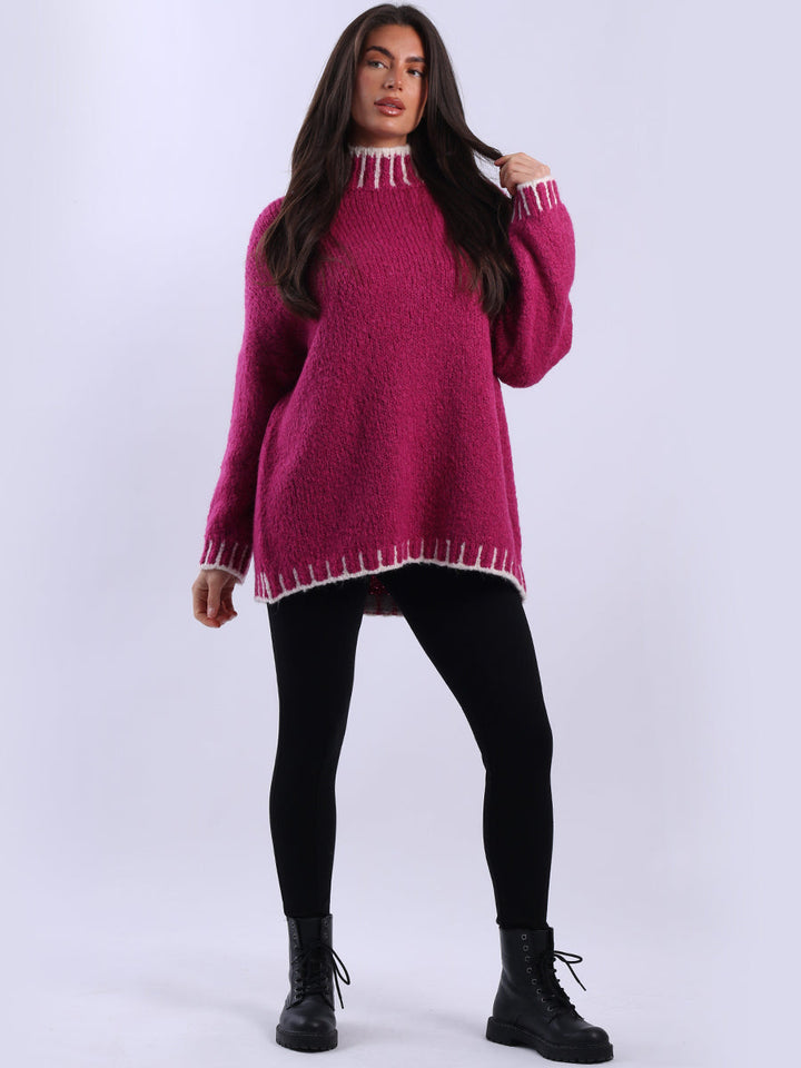 Purple Wholesale Fashion Boutique introduces its much-anticipated winter lineup with this made-in-Italy wool knitted jumper. It ensures subtle sophistication meets everyday practicality. Its whipstitch trim and funnel neck offer warmth and elegance for chilly days. It is ideal to team up with jeans and a cross-body bag.