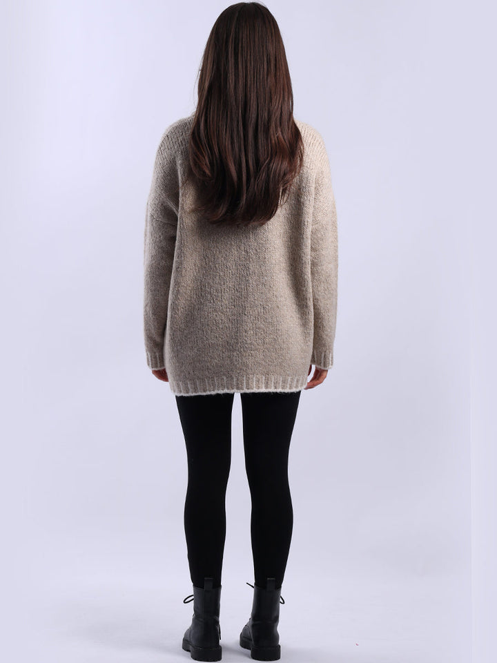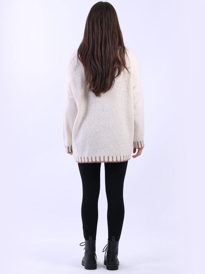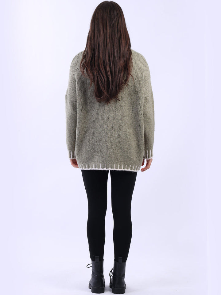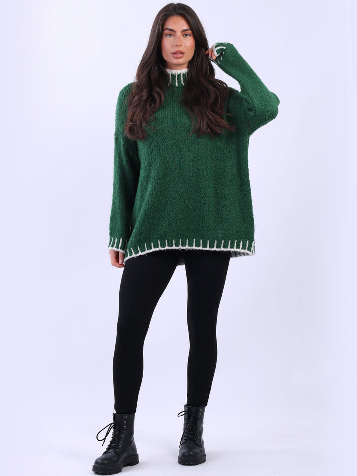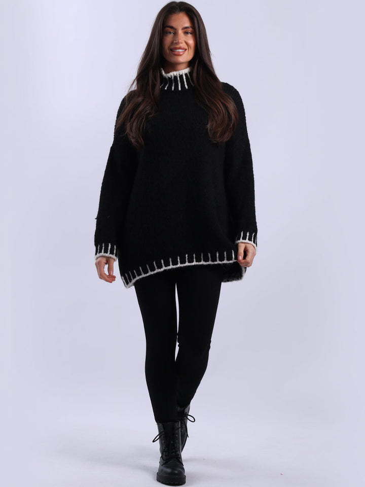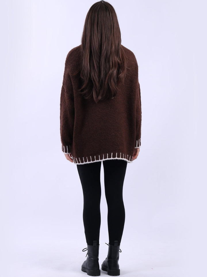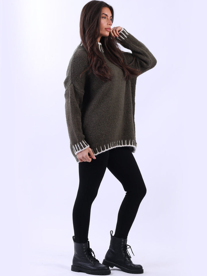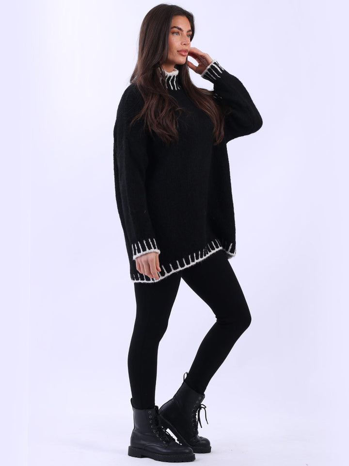 Purple Wholesale Fashion Boutique introduces its much-anticipated winter lineup with this made-in-Italy wool knitted jumper. It ensures subtle sophistication meets everyday practicality. Its whipstitch trim and funnel neck offer warmth and elegance for chilly days. It is ideal to team up with jeans and a cross-body bag.