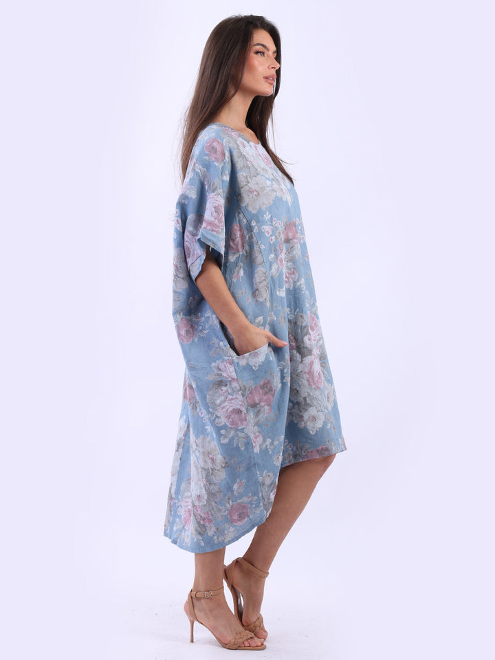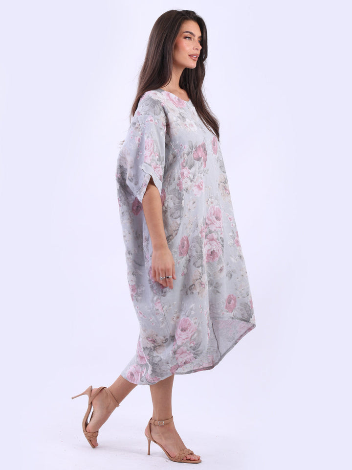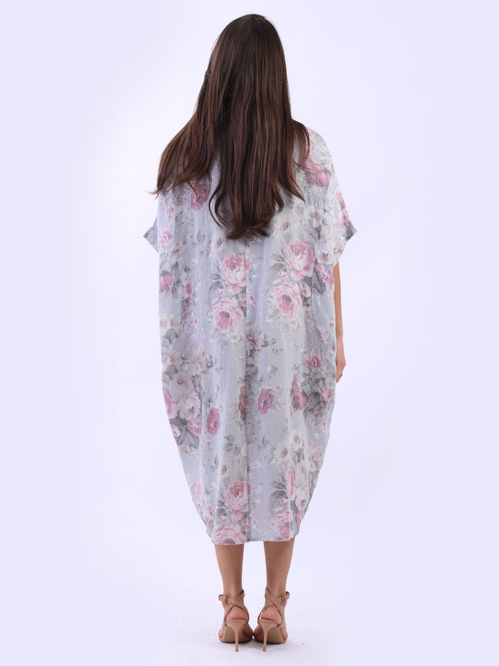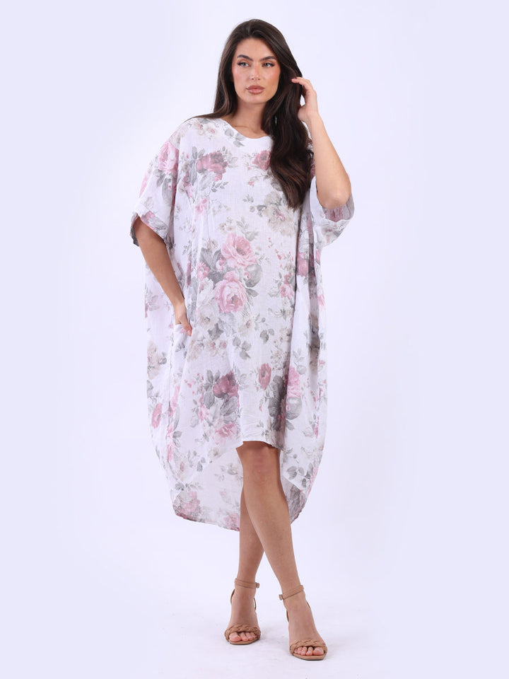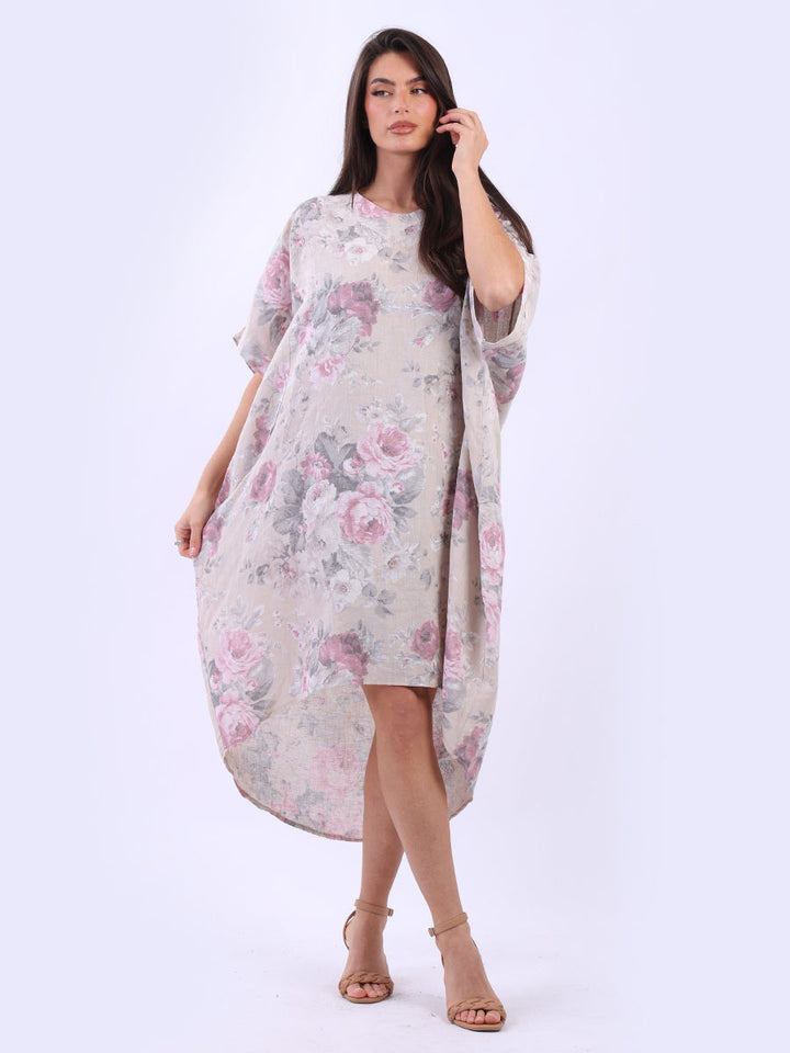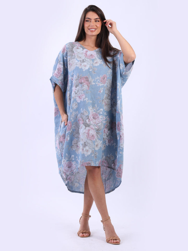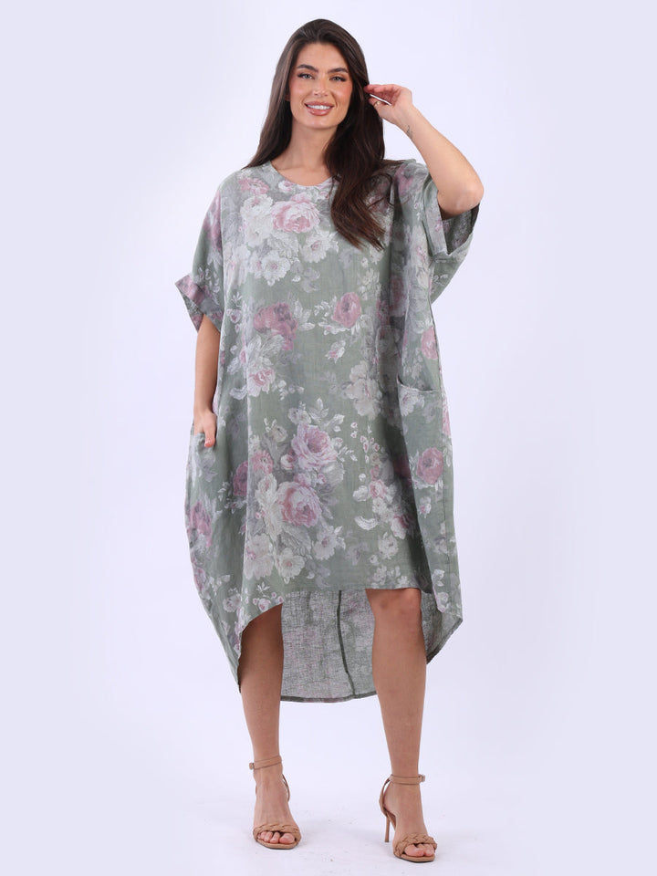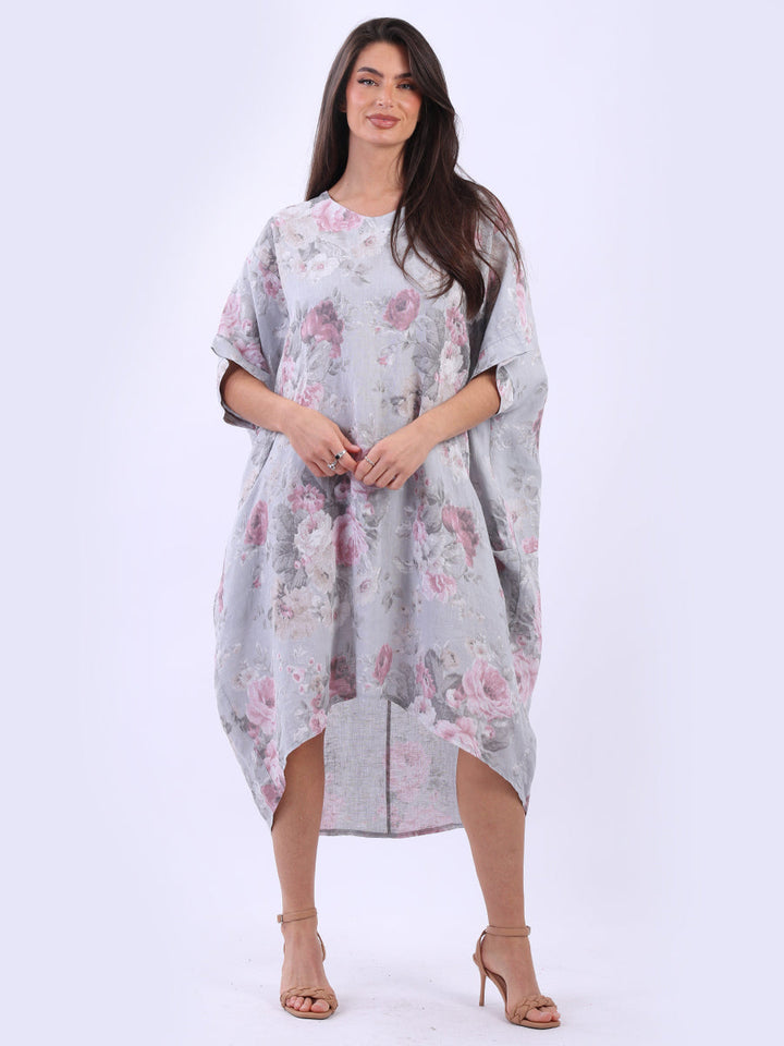 Celebrate the beauty of floral prints with this enchanting made in Italy lagenlook dress. Its oversized, relaxed fit and soft linen fabric make it a great choice for easy, laid-back days. The charming floral pattern adds a romantic touch, perfect for cozy autumn afternoons or layering up for winter. This hi-low dress is crafted for women who love gentle, free-flowing styles.