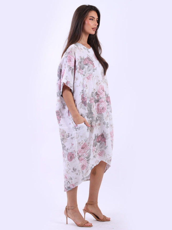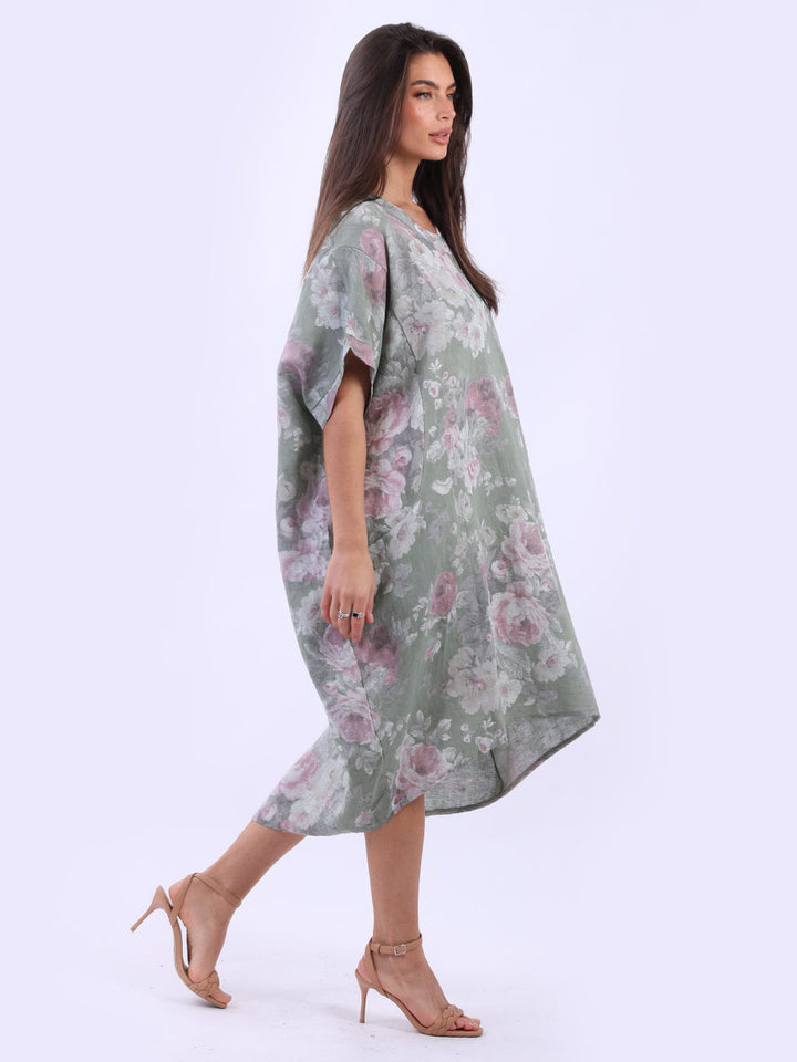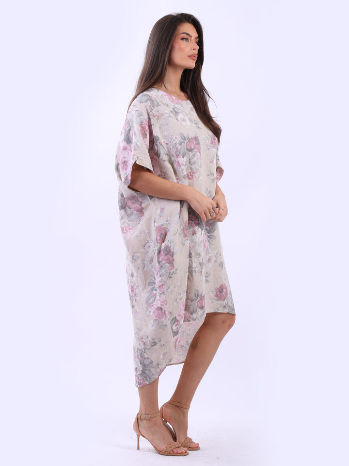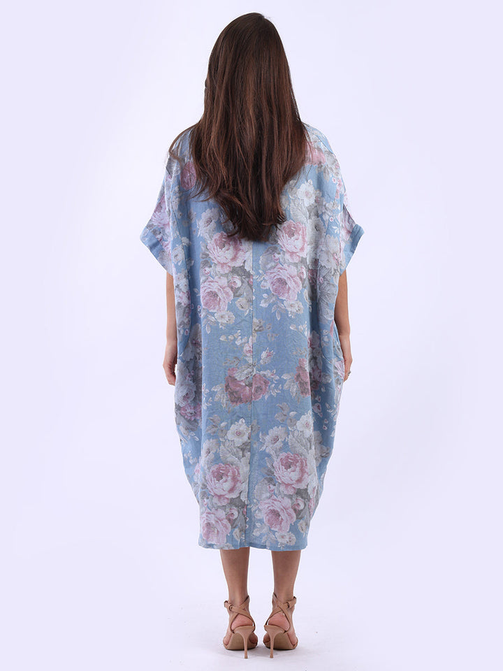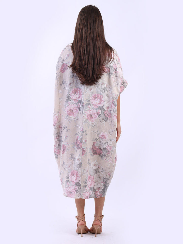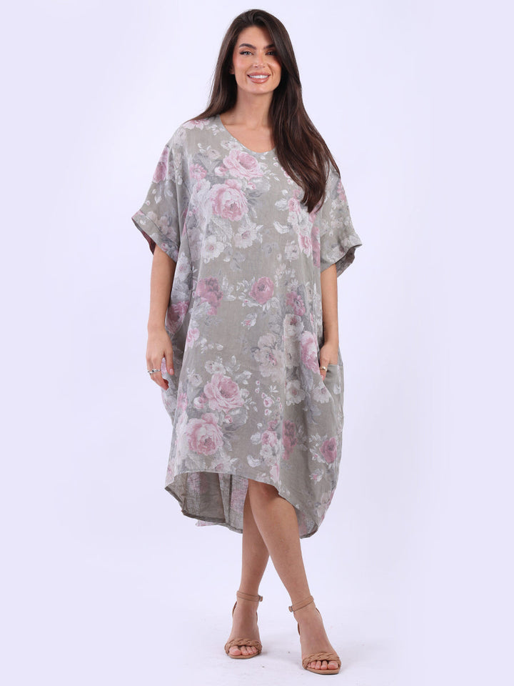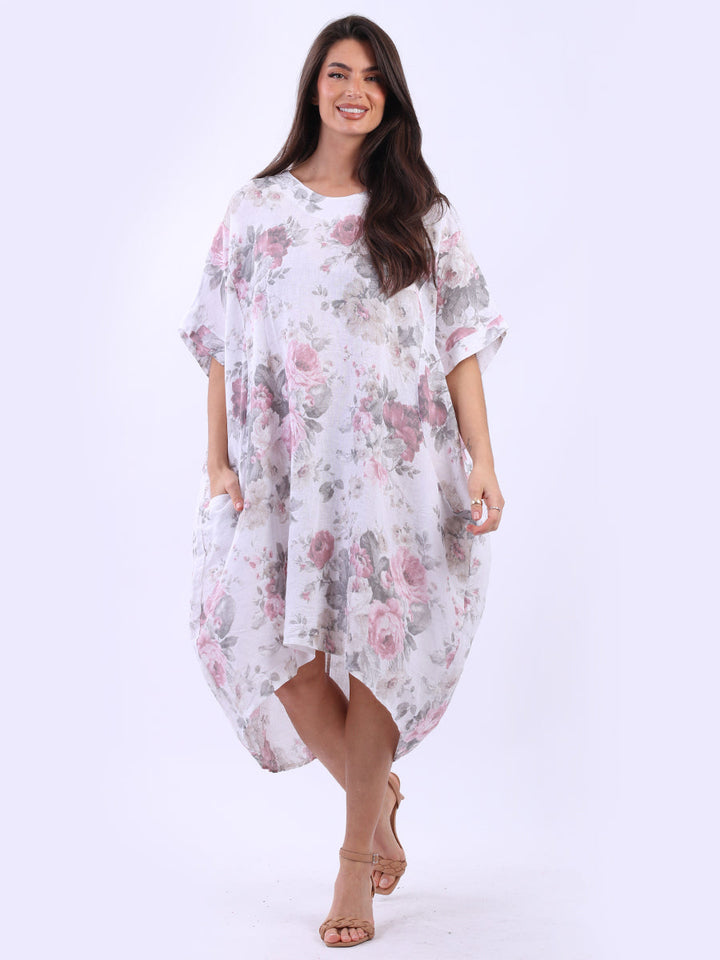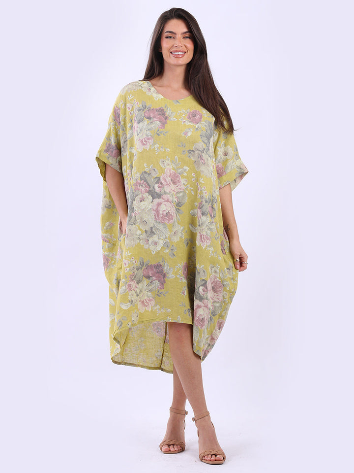 Celebrate the beauty of floral prints with this enchanting made in Italy lagenlook dress. Its oversized, relaxed fit and soft linen fabric make it a great choice for easy, laid-back days. The charming floral pattern adds a romantic touch, perfect for cozy autumn afternoons or layering up for winter. This hi-low dress is crafted for women who love gentle, free-flowing styles.