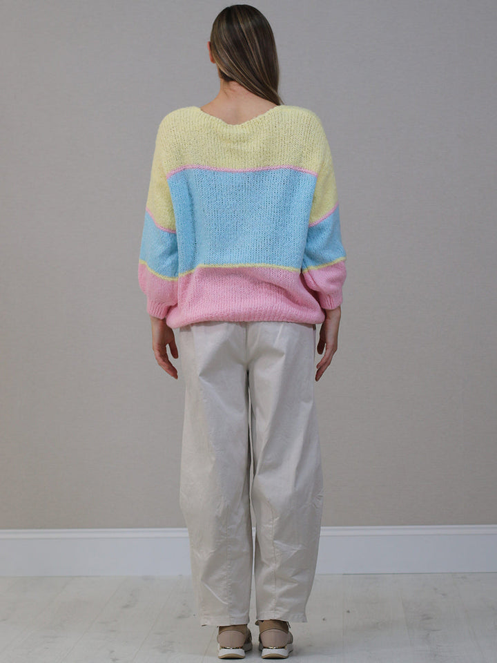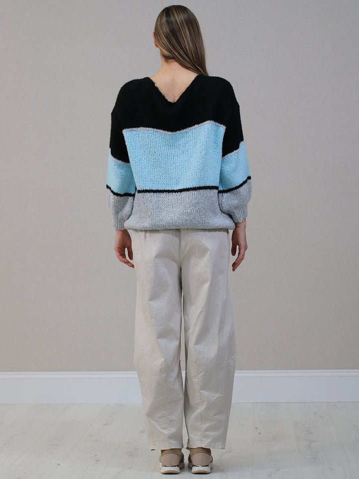 PurpleWholesale delivers authentic Italian quality with bold patterns and effortless style. Crafted in Italy, this wool cardigan blends vibrant tones with a clean silhouette. Drop shoulders, v-neck, front button fastening, and ribbed sleeves give it a relaxed drape that flatters oversized women’s wardrobes. It’s the kind of knit ladies will reach for season after season.